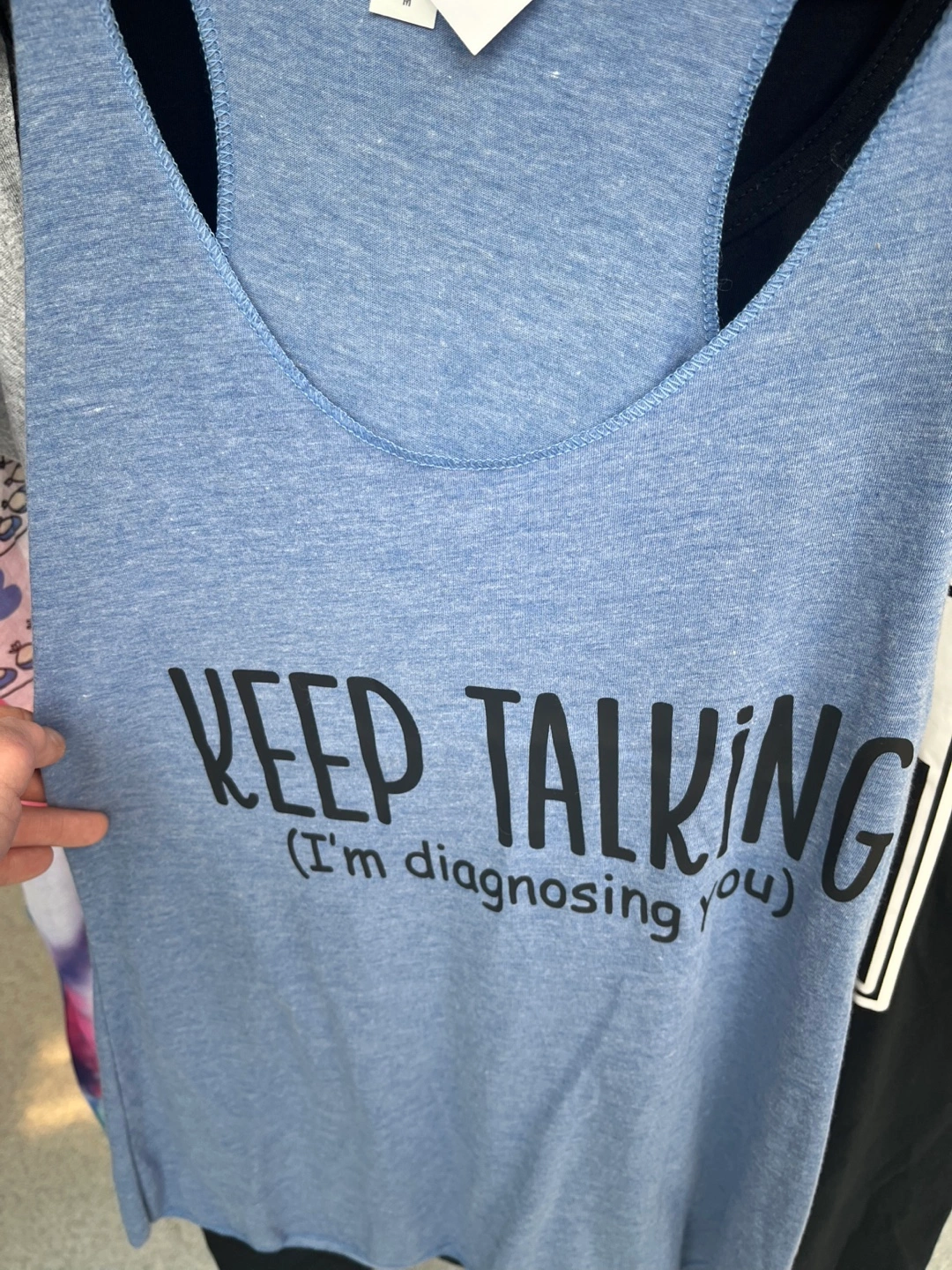 89Blue racerback tank top. Features a funny saying. Relaxed fit. Lightweight material. Custom Vinyl Print Pet friendly/ns