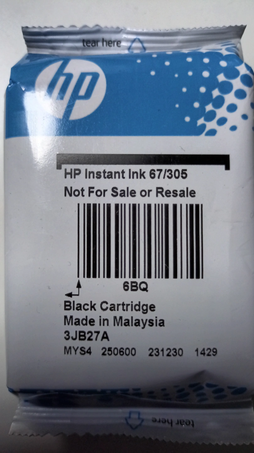1000+HP Instant Ink black cartridge. Made in Malaysia. Not for sale or resale. Package shows some minor wear.