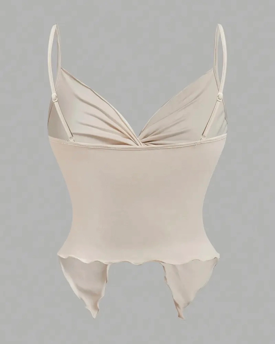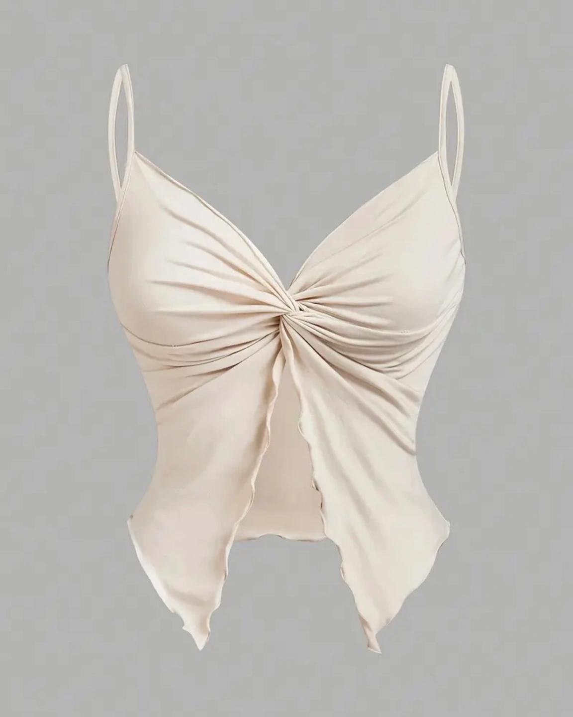 Stylish beige cami top. Features a knotted front and asymmetrical hem. Lightweight and comfortable material. Perfect for layering or wearing on its own.