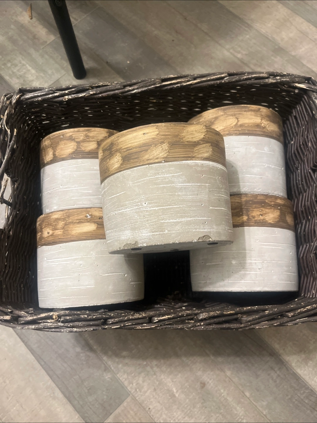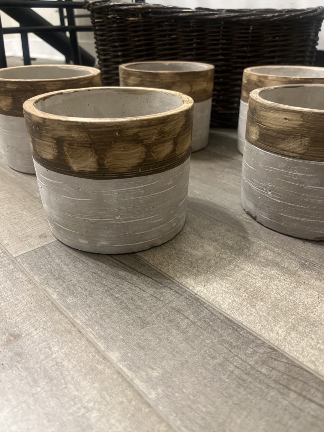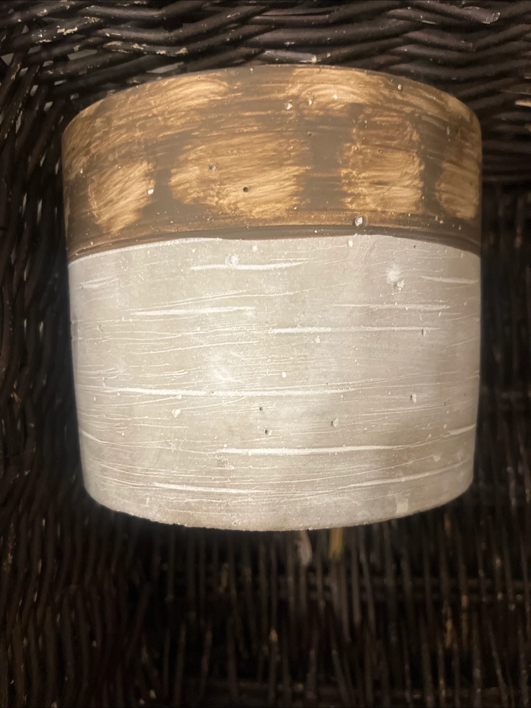 Modern concrete planters. Two-toned design. Grey and brown. Perfect for small plants or home decor. They come in a rustic basket great for storage.