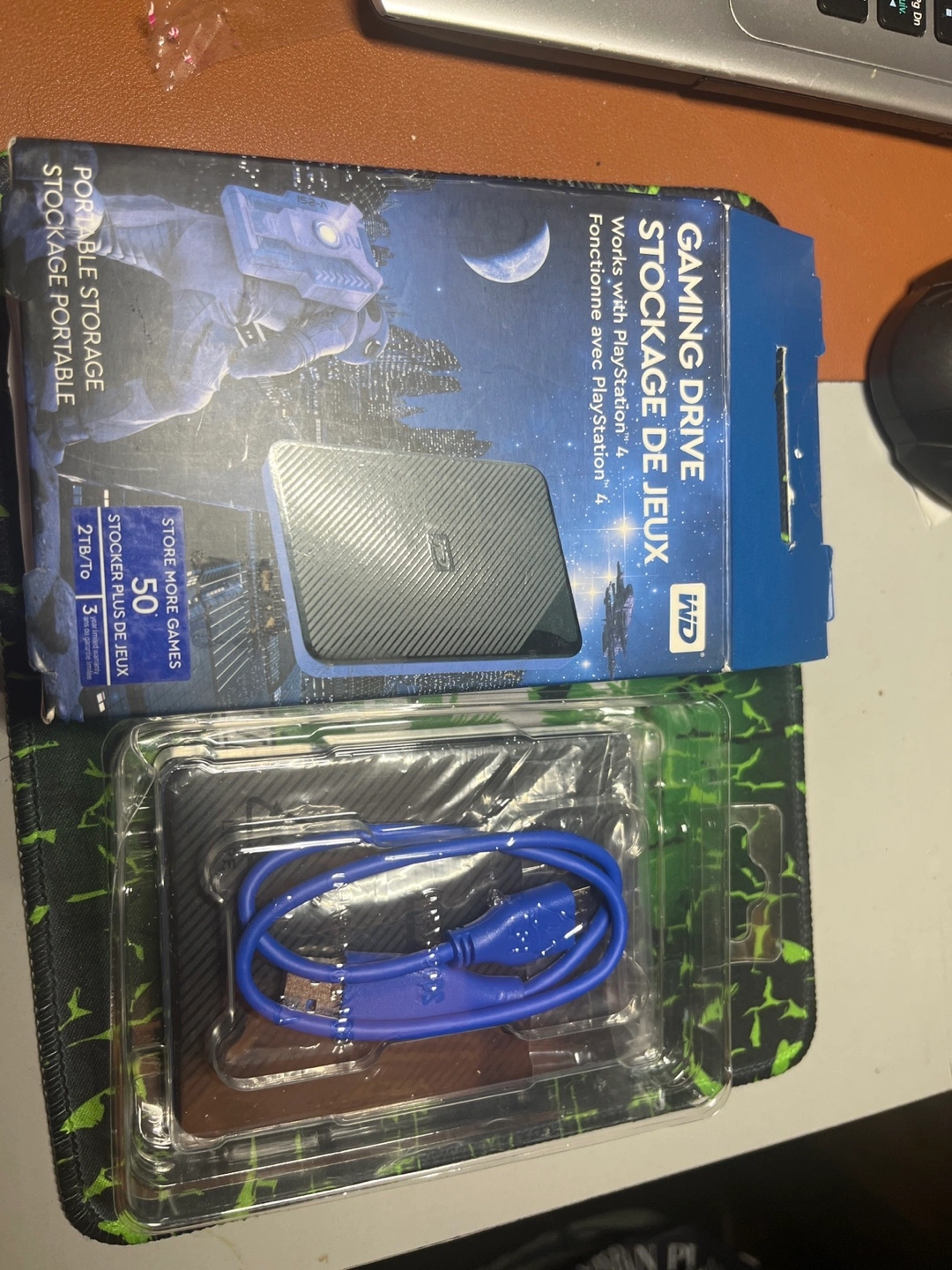 2TB portable external hard drive. Works with Playstation 4. Storage for 50+ games. Includes USB cable. New, still in packaging.