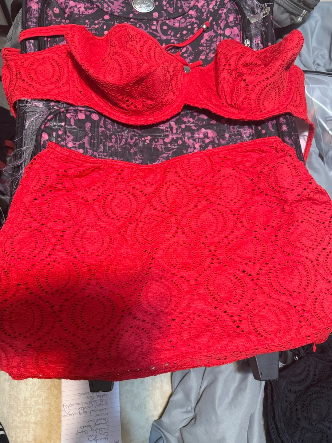 Red crochet bikini set. Includes a bandeau top and a skirt. Size Medium/36FF. Worth $200. Asking $100 OBO