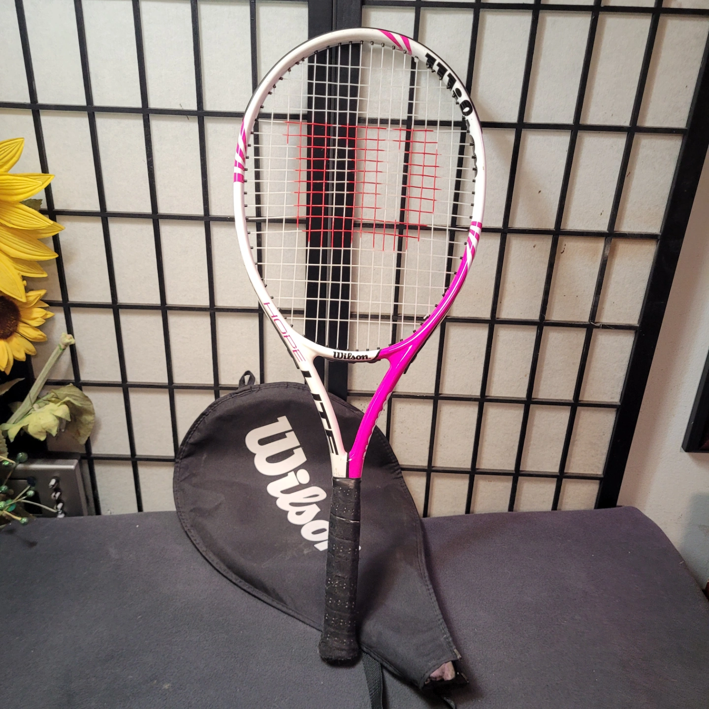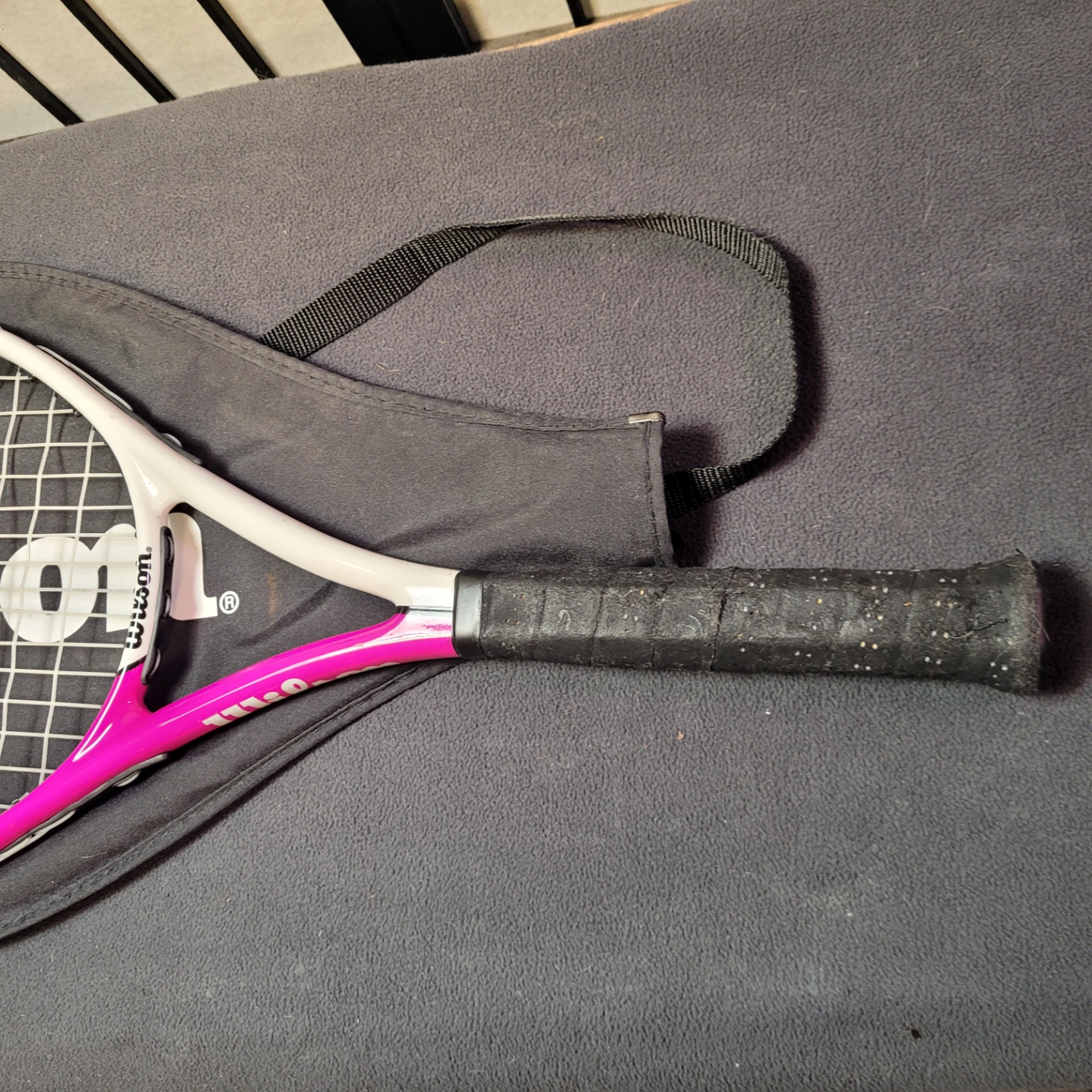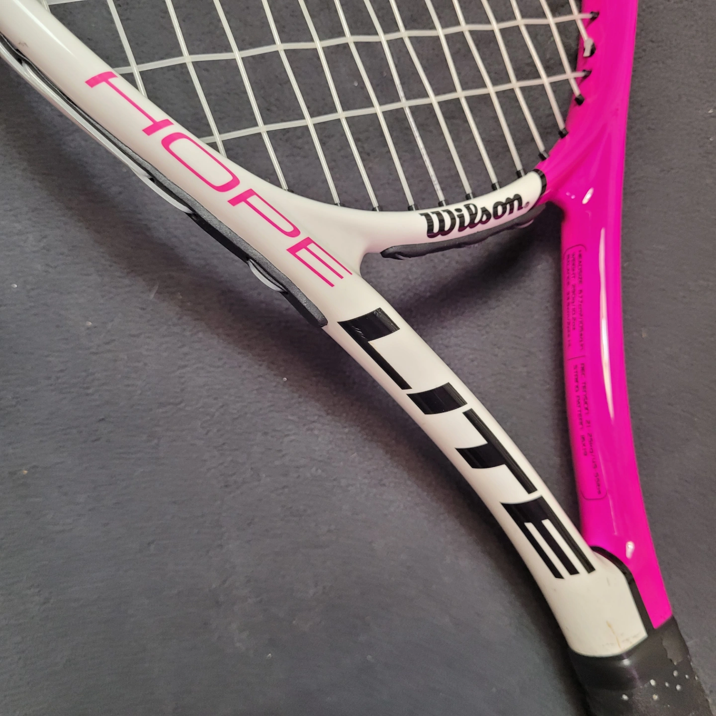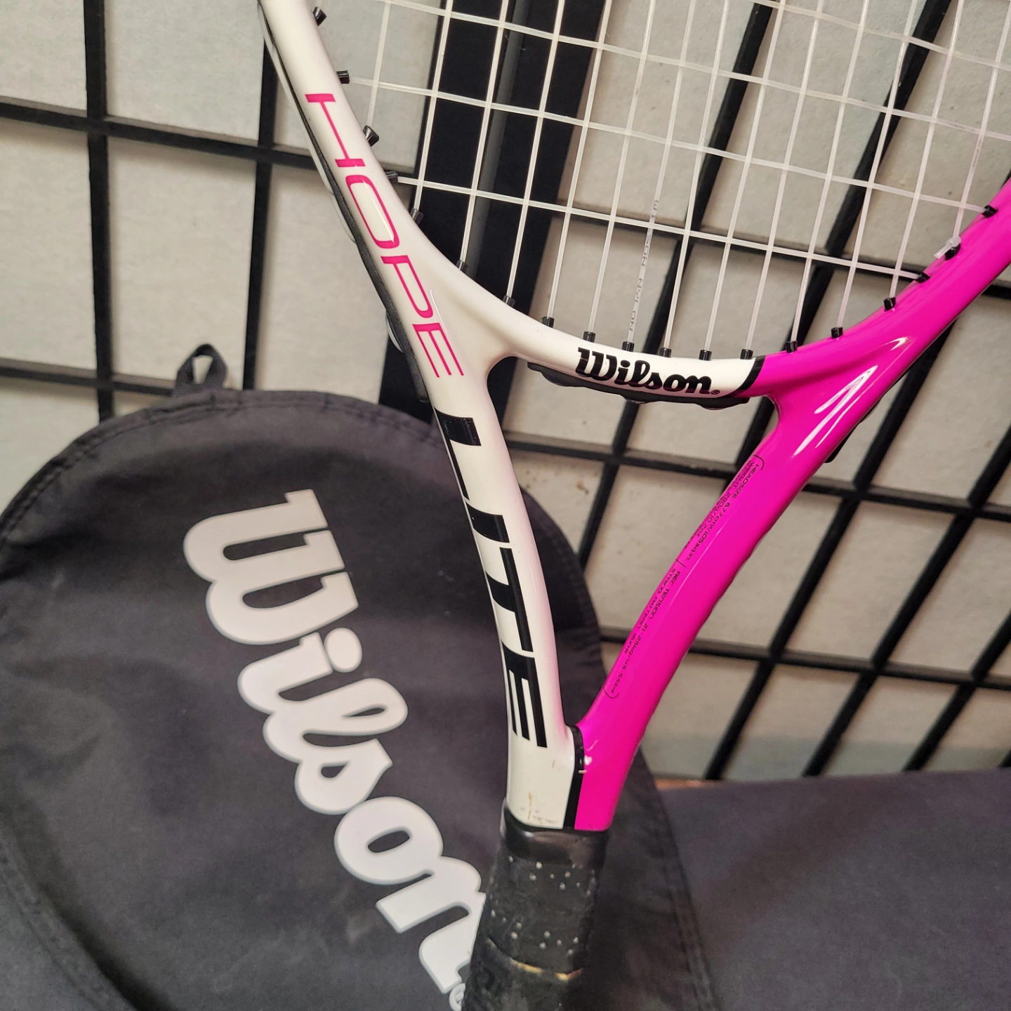 Used Wilson Hope Lite tennis racquet. Pink and white colour scheme. Includes a Wilson carrying case. Great for beginners.
