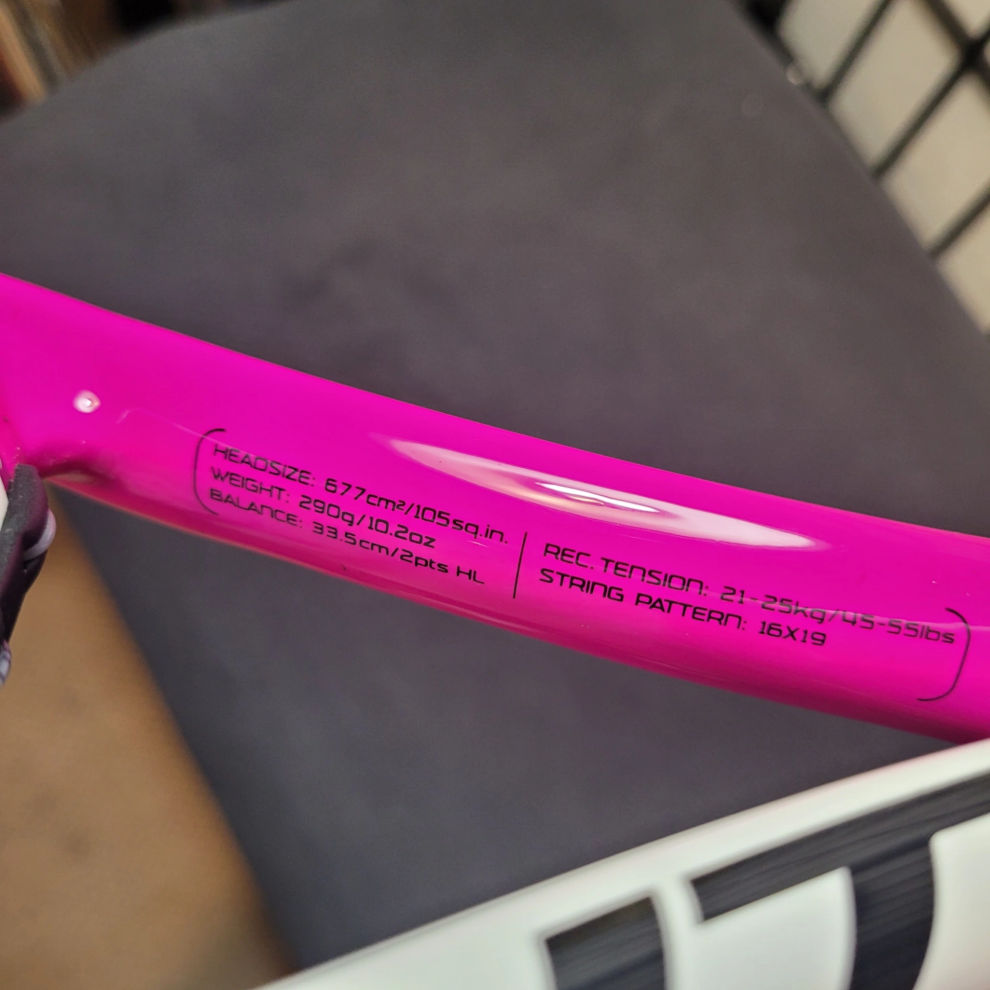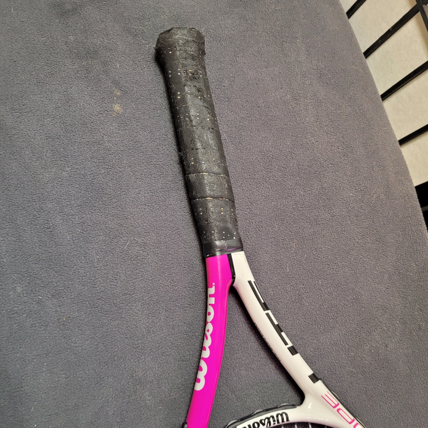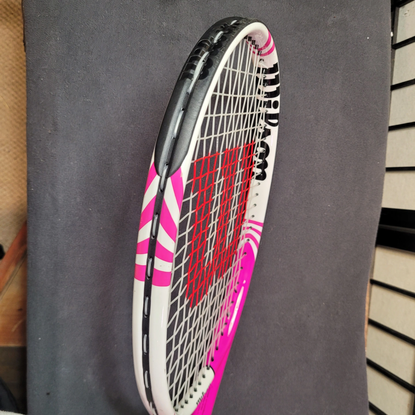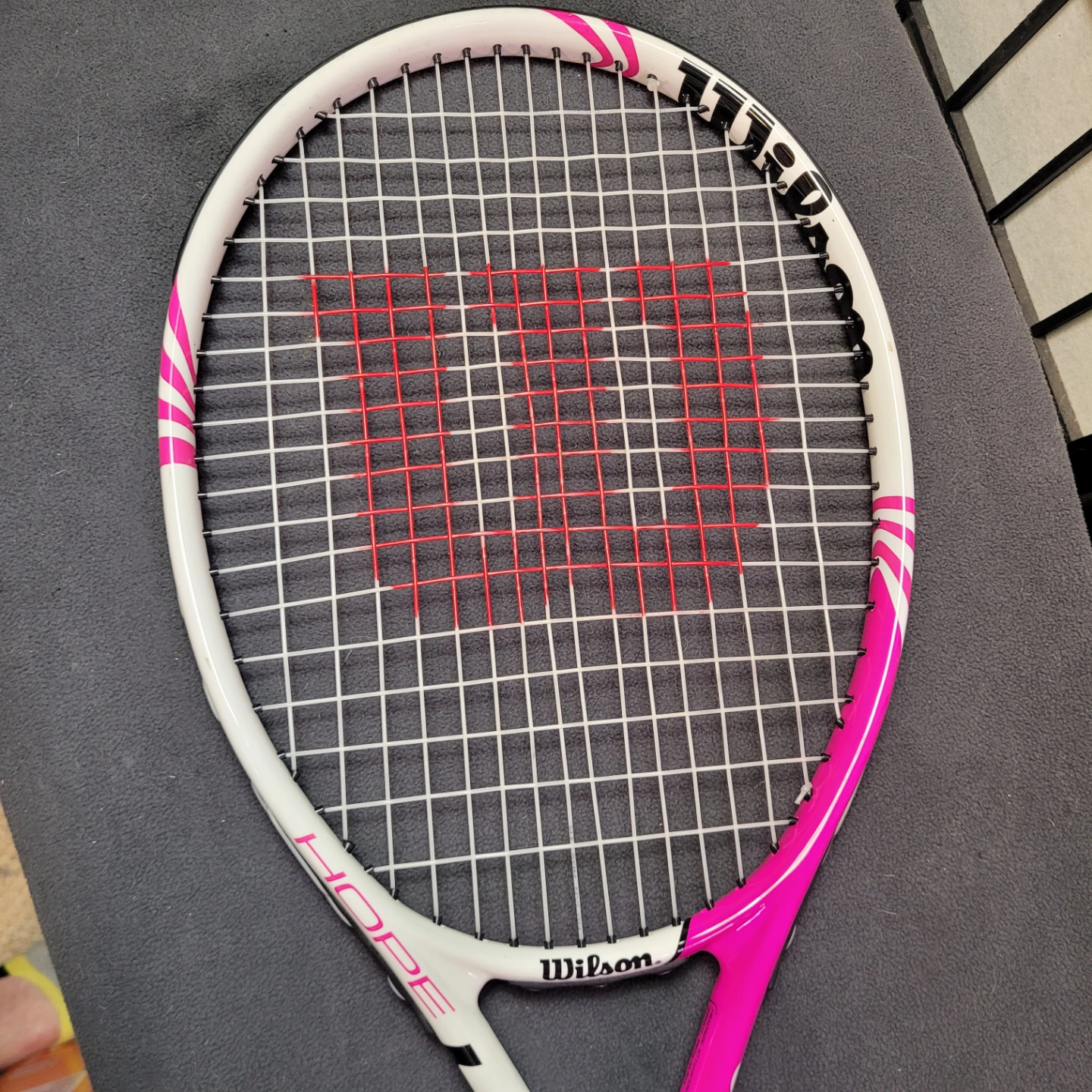 Used Wilson Hope Lite tennis racquet. Pink and white colour scheme. Includes a Wilson carrying case. Great for beginners.