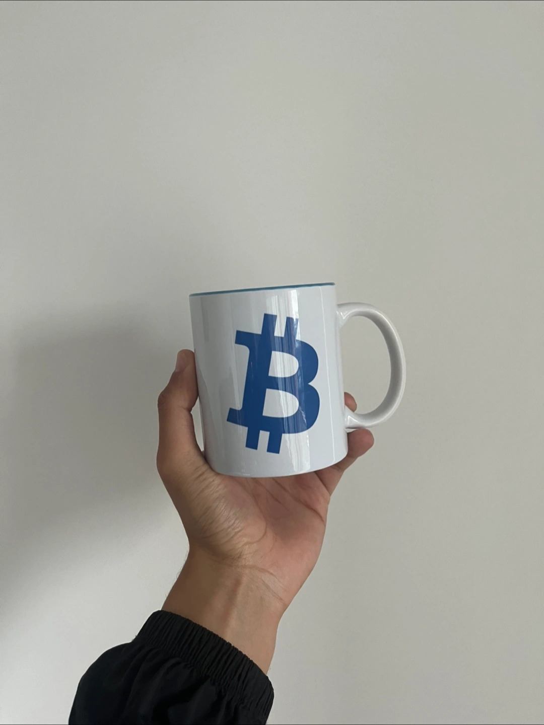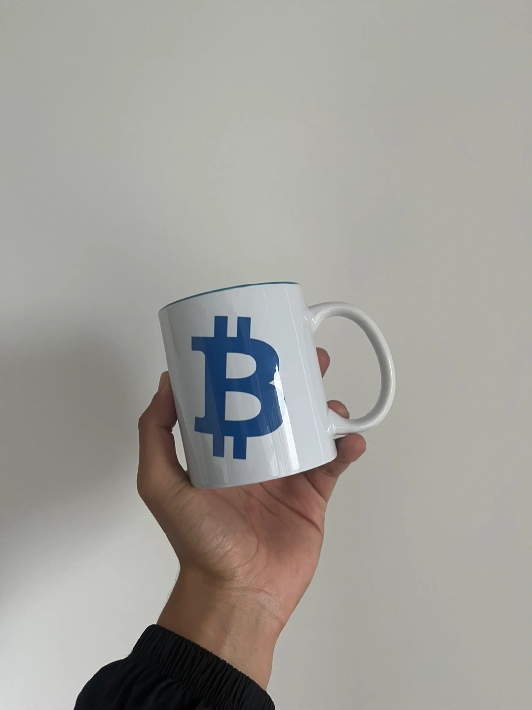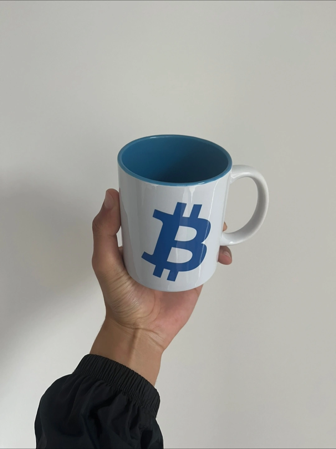 Brand New White ceramic Bitcoin mug. Blue interior. Perfect for coffee or tea or drinking your Bitcoin gains away!