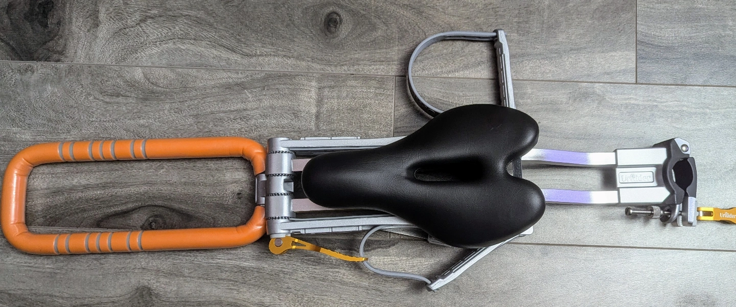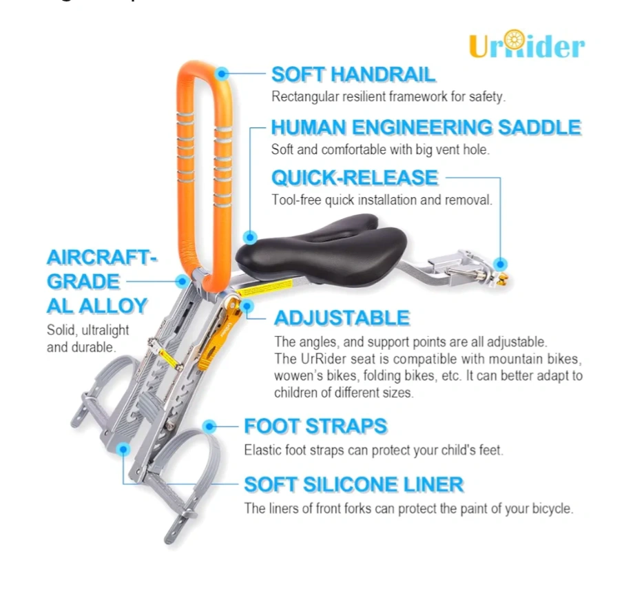 Adjustable child bike seat. Features soft handrail, comfortable saddle, quick release. Aircraft-grade aluminum alloy. Foot straps included. Compatible with various bikes.