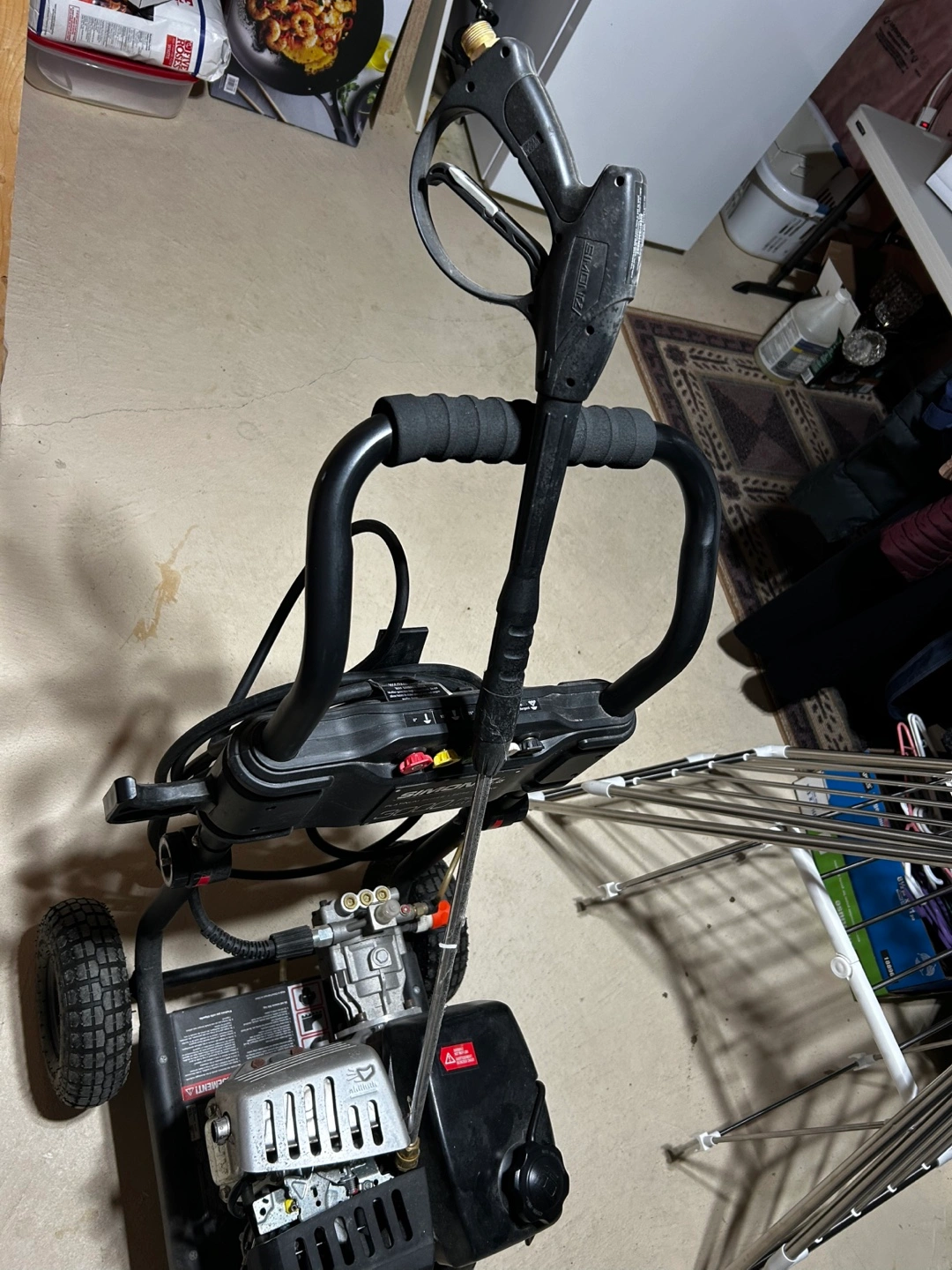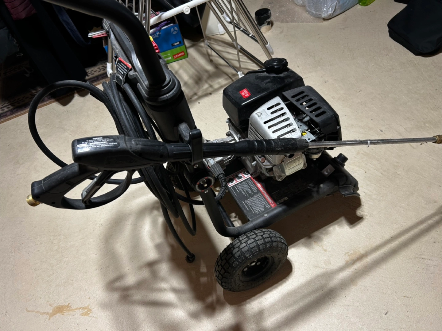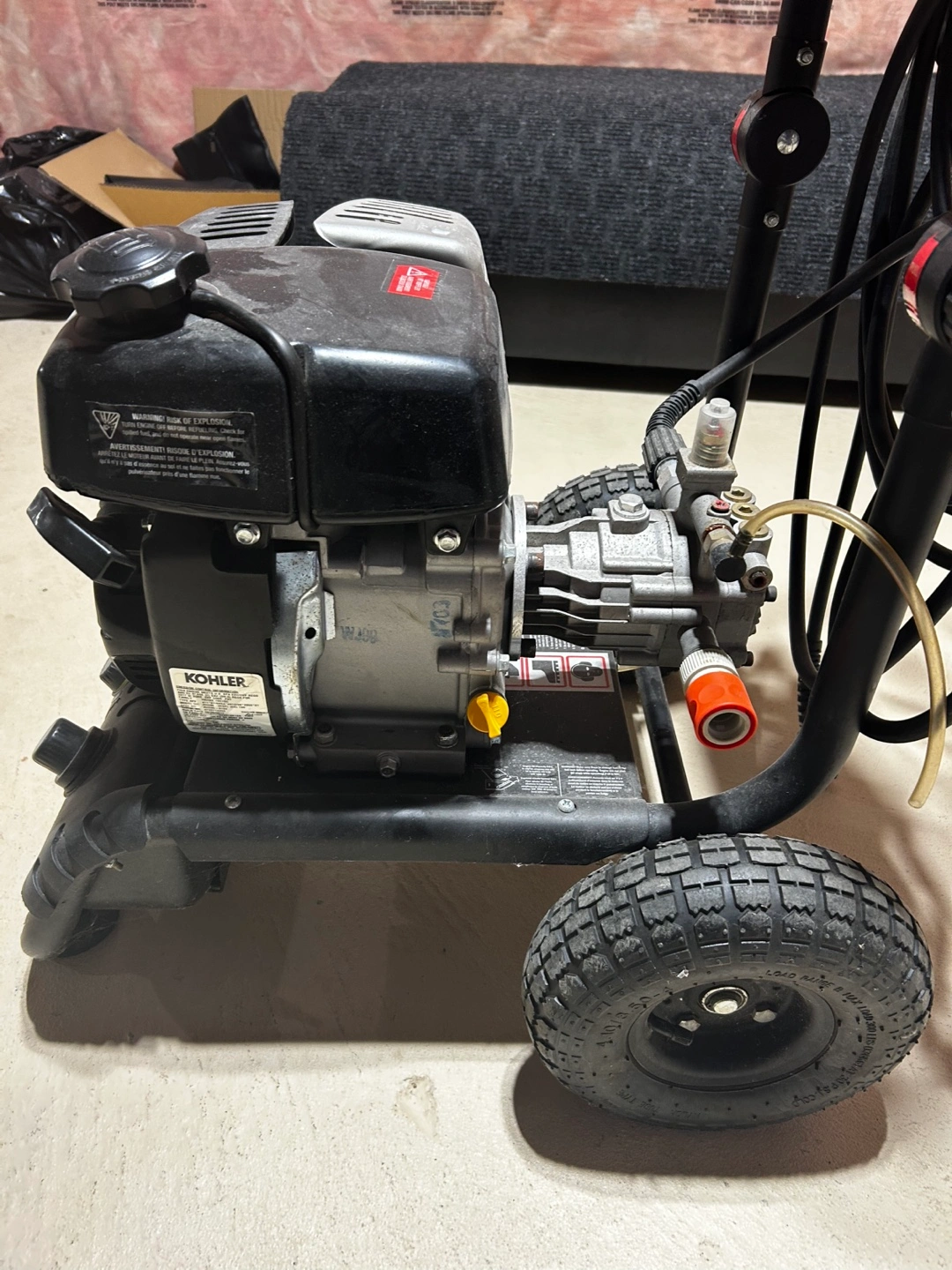 Gas-powered pressure washer. Kohler engine. 3000 PSI. Platinum Series. Includes various nozzle attachments. Wheels for easy mobility. Hose included.