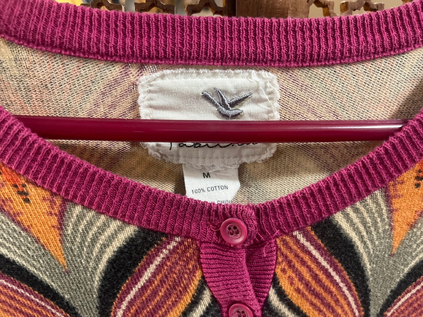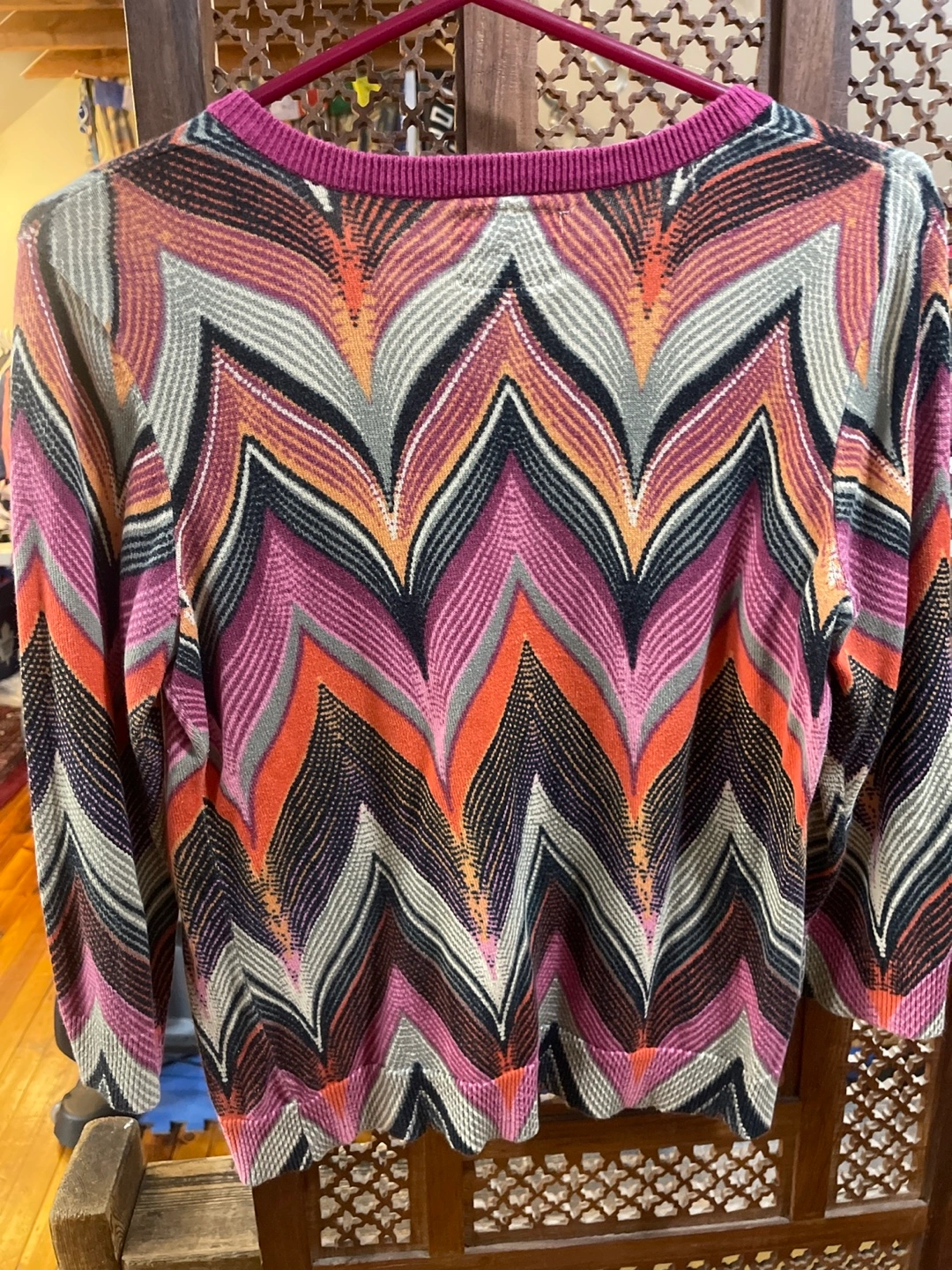 Multicoloured chevron pattern. Three-quarter sleeves. Button closure. 100% cotton.