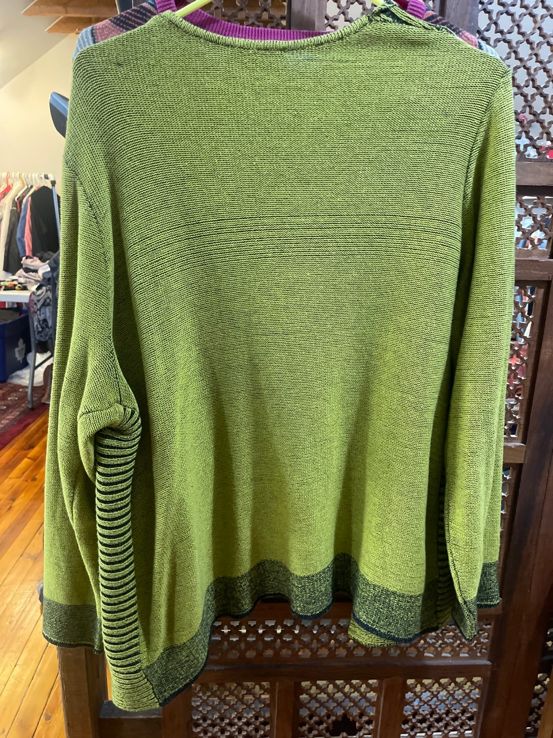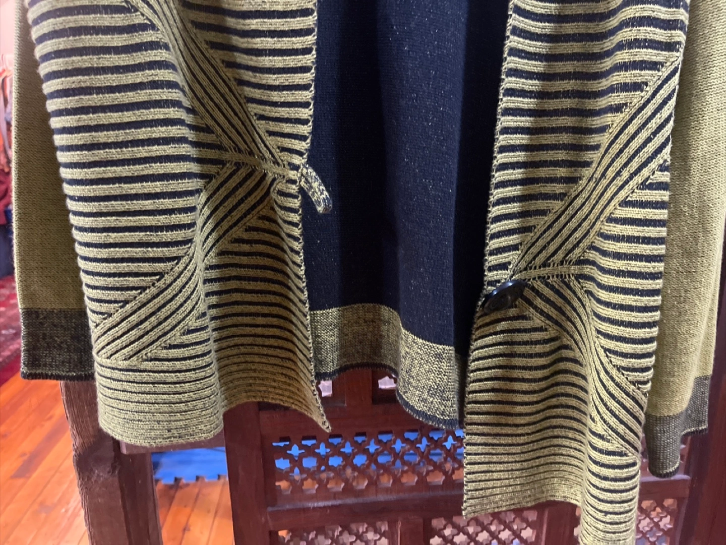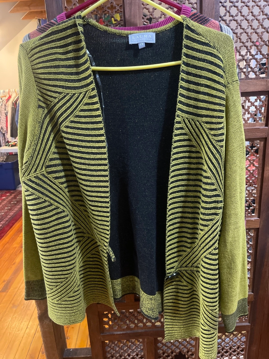 Lightweight knit cardigan. Olive green and black stripes. Geometric design accents. Open front. Long sleeves. Size 1X.