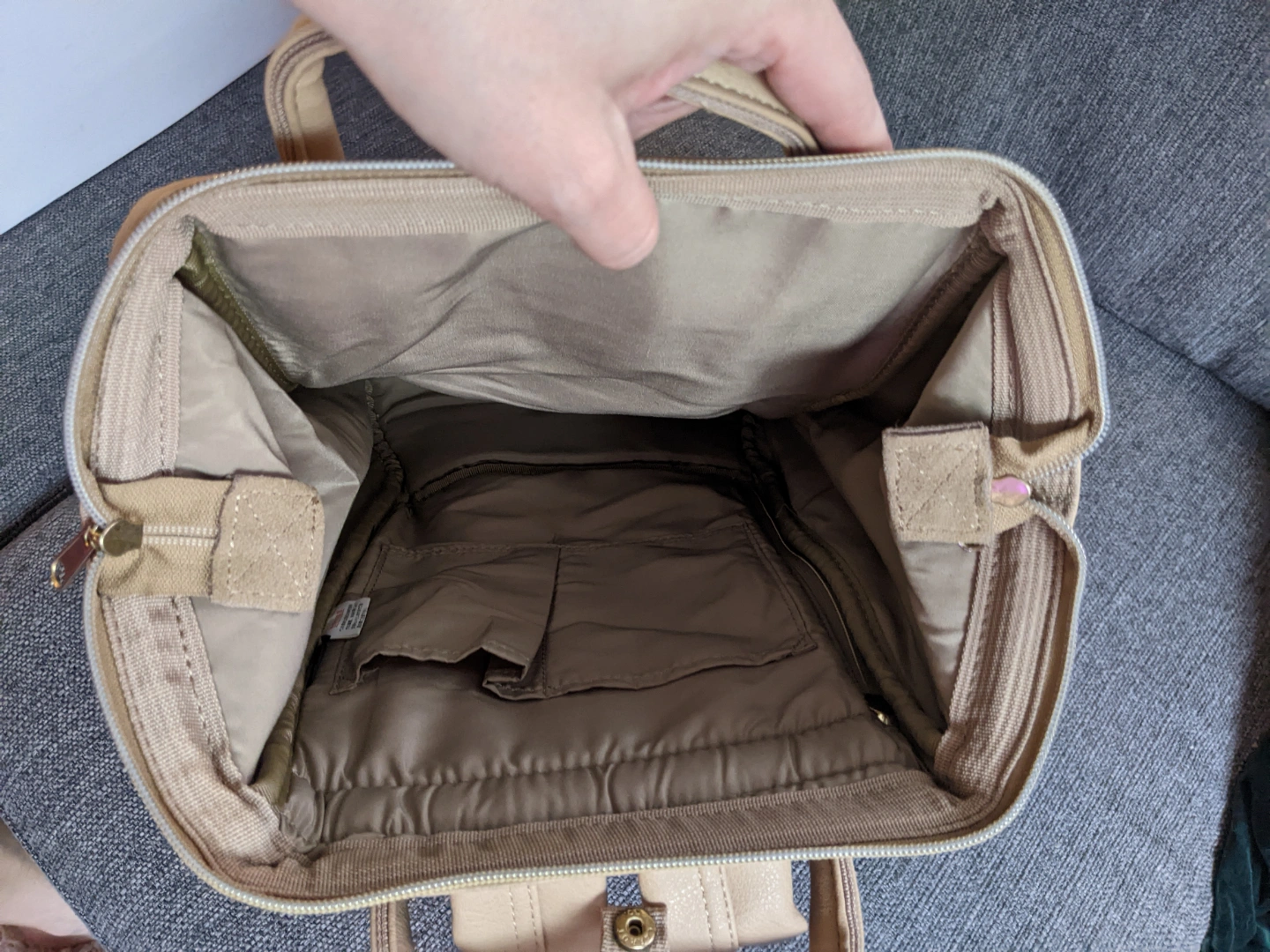 gorgeous beige coloured faux leather backpack with handles. not visible wear, just a few Acuff marks that could be removed with a magic eraser. many pockets and adjustable straps. a good size. spots for water bottles.snap and zip closures. brand is Anello, designed by carrot co in Japan