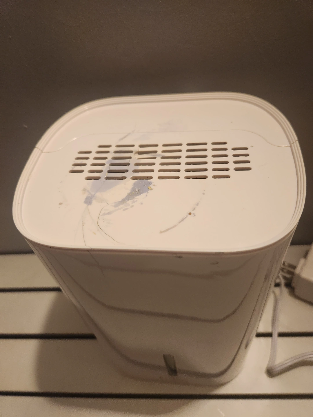 Small white dehumidifier with power cord. There's dried up paint and a few hairline fracture when I accidentally dropped my paintbrush. Still in working order. Selling this because my landlord finally put in a bathroom exhaust. Mold is bad for you. Make sure you have ventilation otherwise this works just as good. Amazon sells for $70.