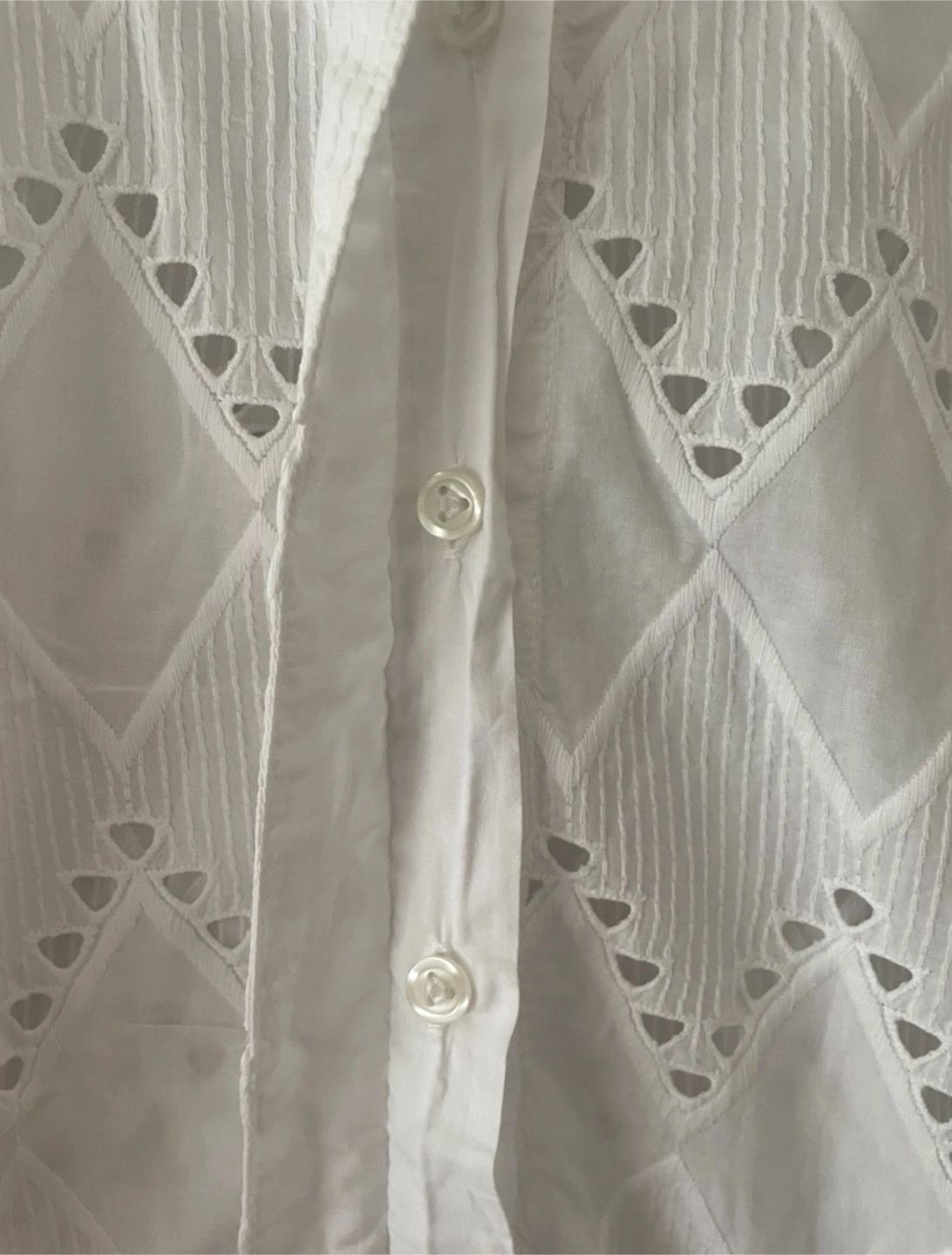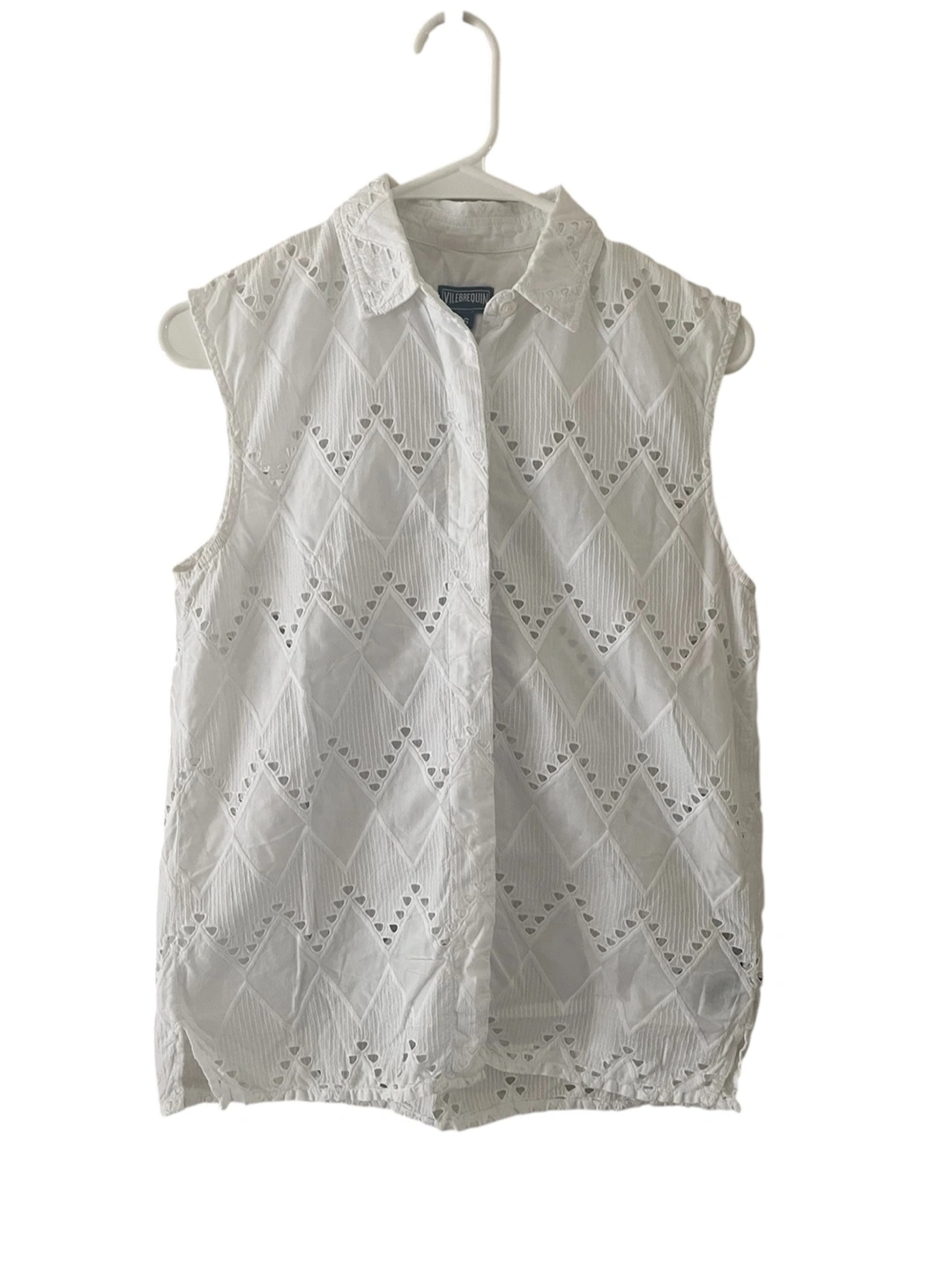 Women's white sleeveless collared shirt with eyelet design. Button-up closure. Chevron-style cut-outs. Size XS.