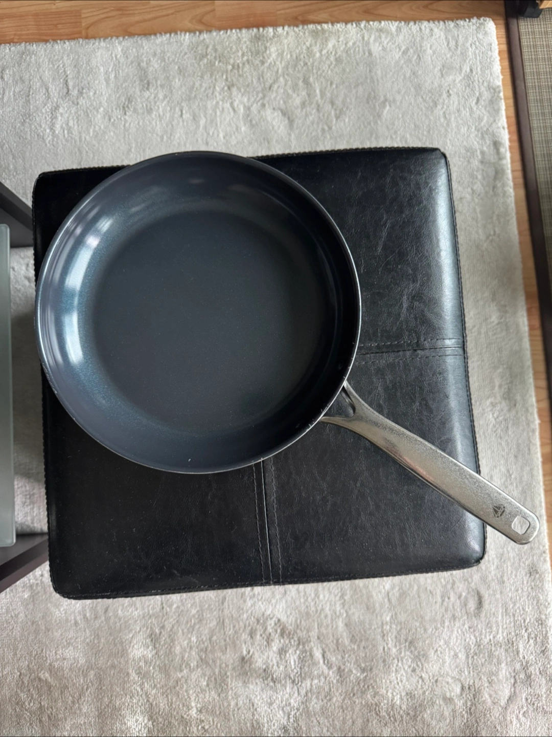 Very lightly used frying pan. Durable ceramic non-stick coating. Silver handle. Great for everyday cooking. Dishwasher and broiler safe. Very good condition. Just some minor signs of wear and tear (see last photo).