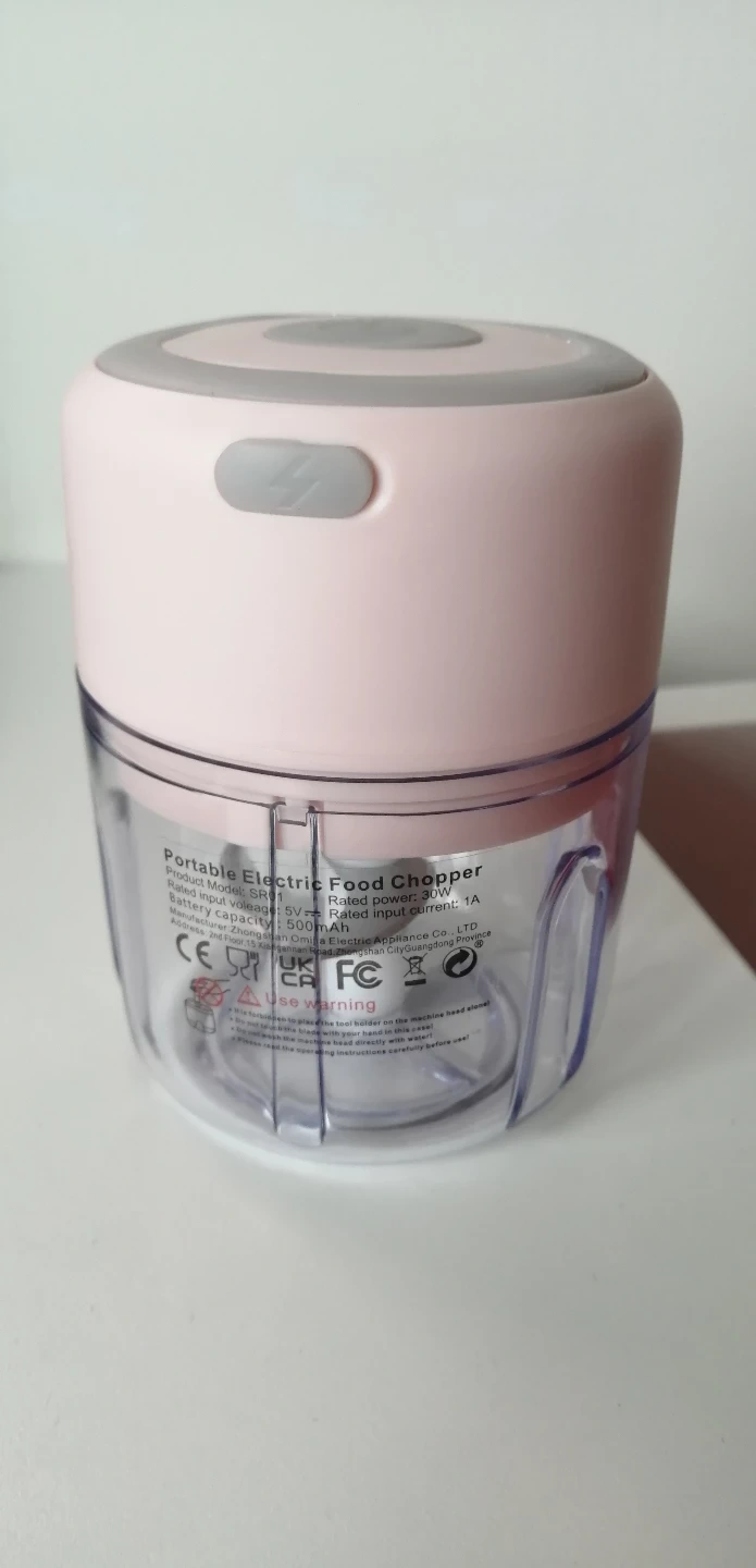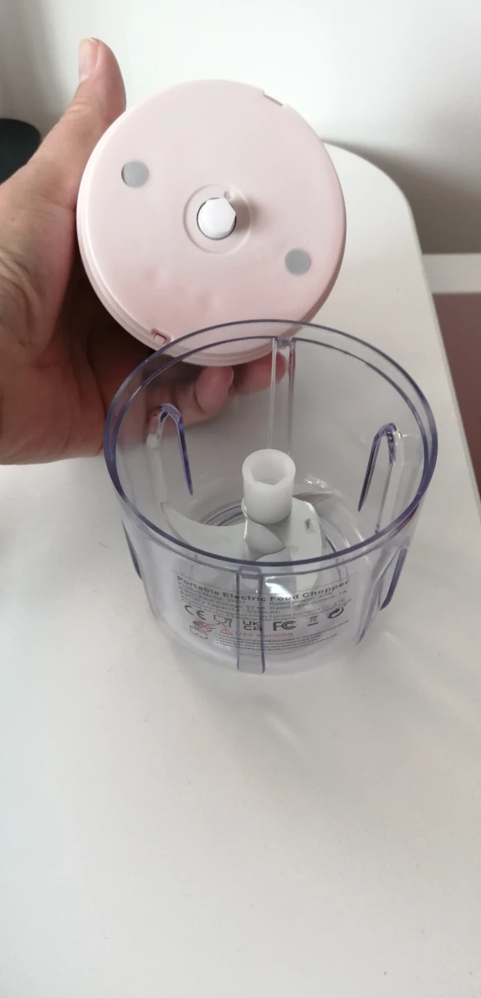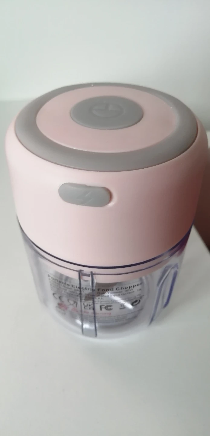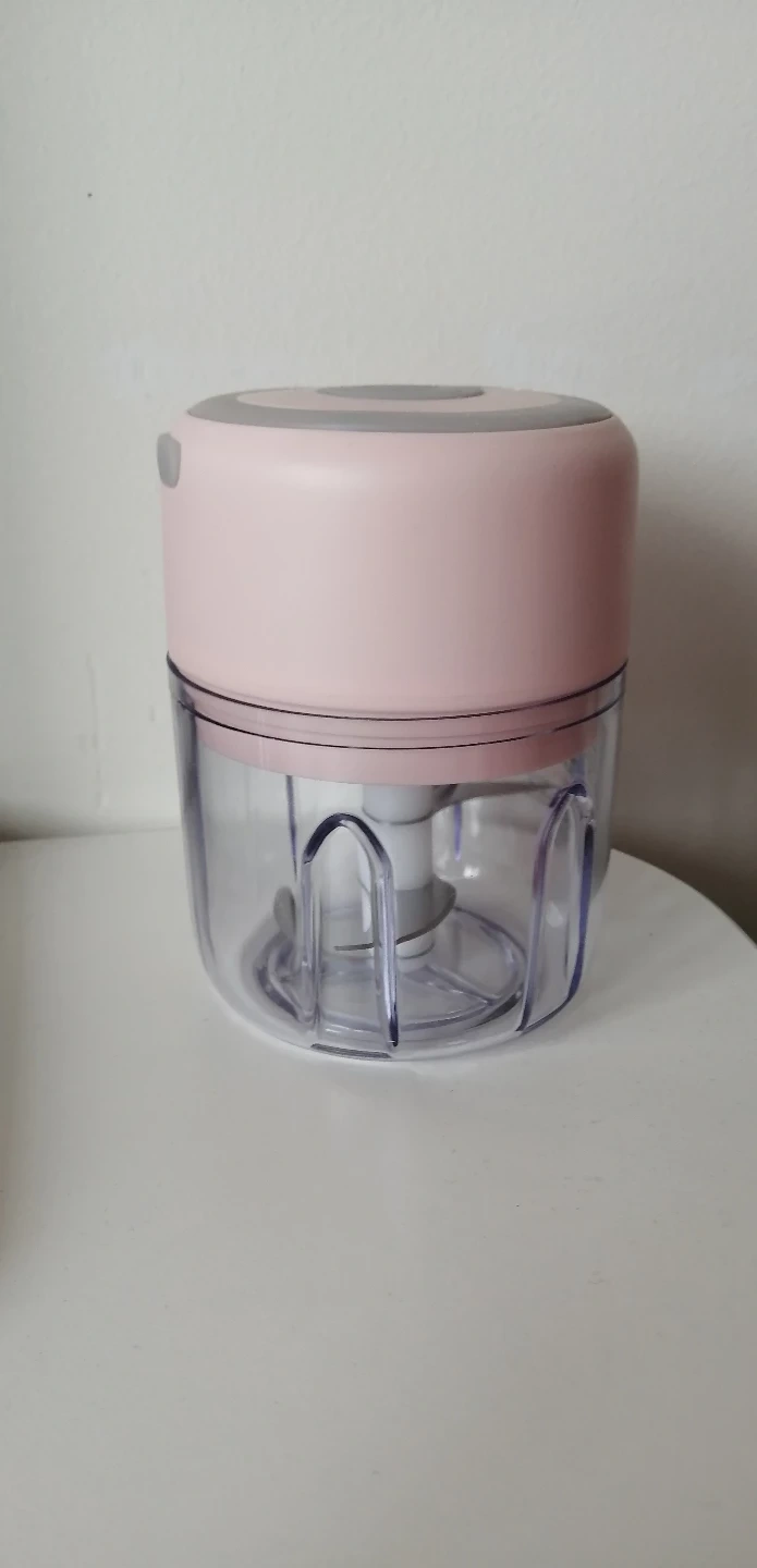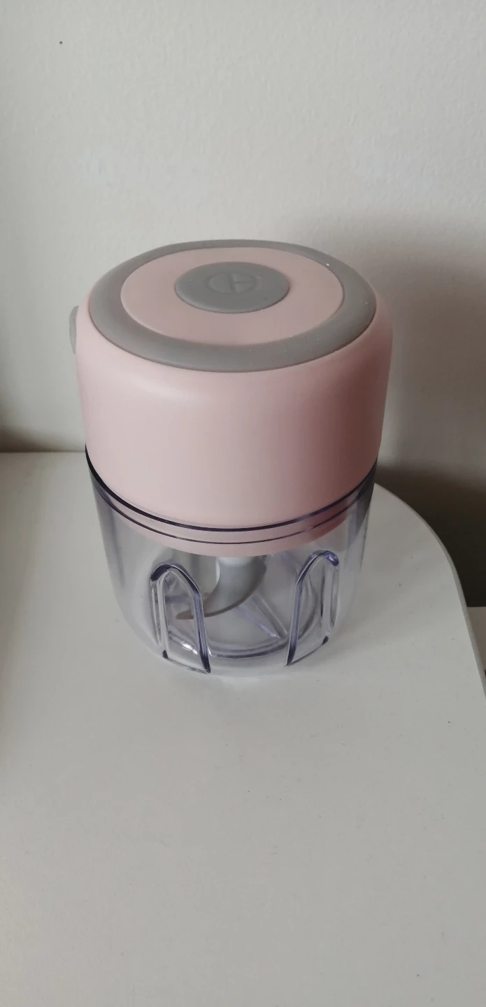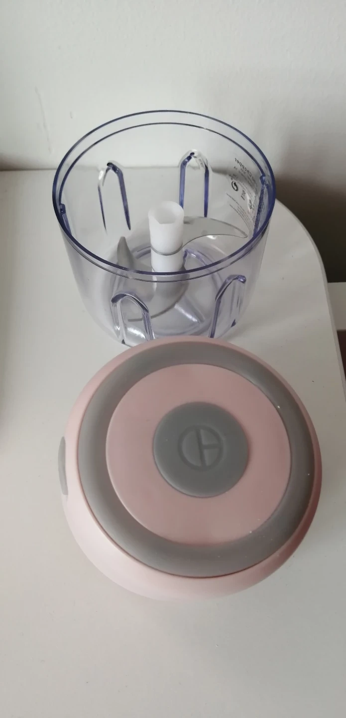 Mini food chopper. Pink and grey. Compact and easy to use. Great for chopping herbs, nuts, and other small ingredients.