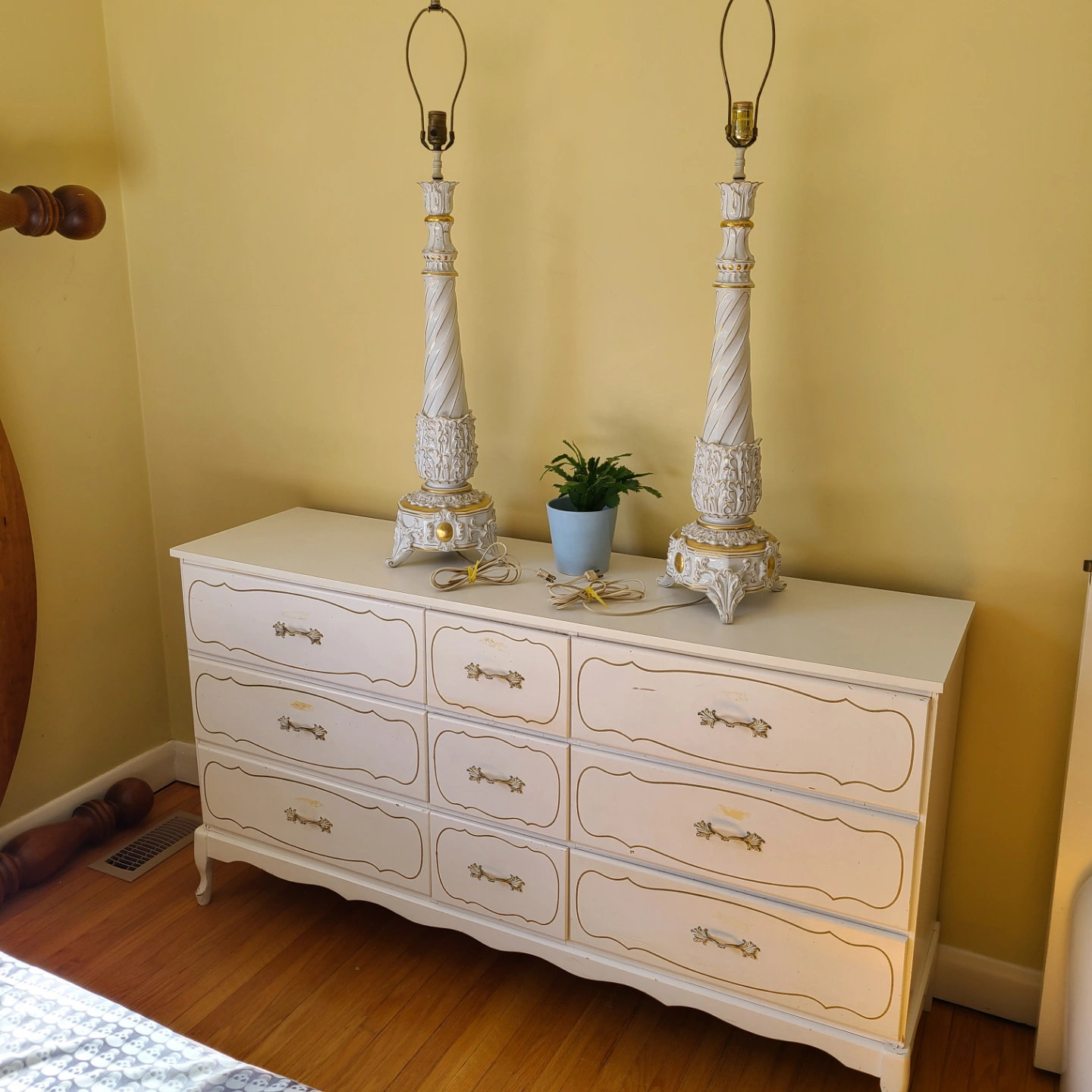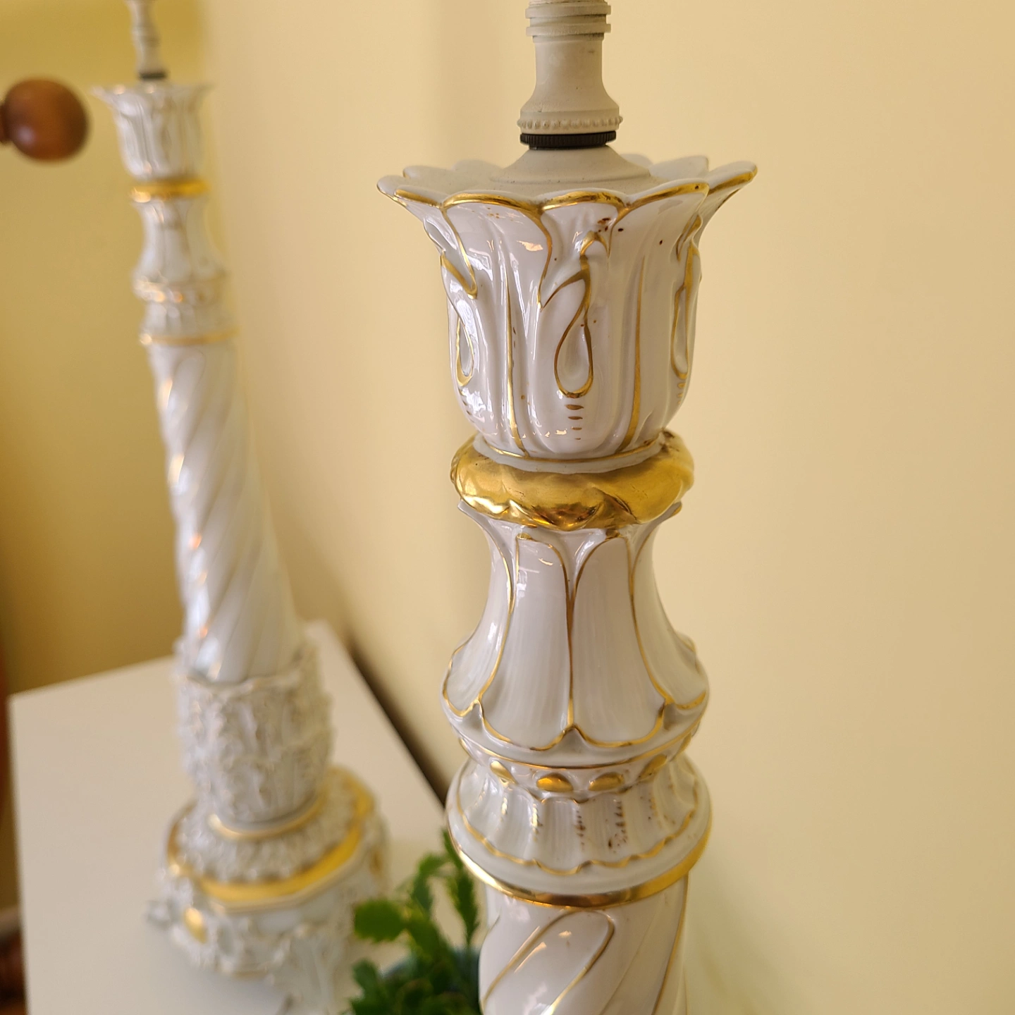 Pair of vintage table lamps. Ornate porcelain bases, gold detailing. Twisted column design. Classic style, perfect for a traditional setting.