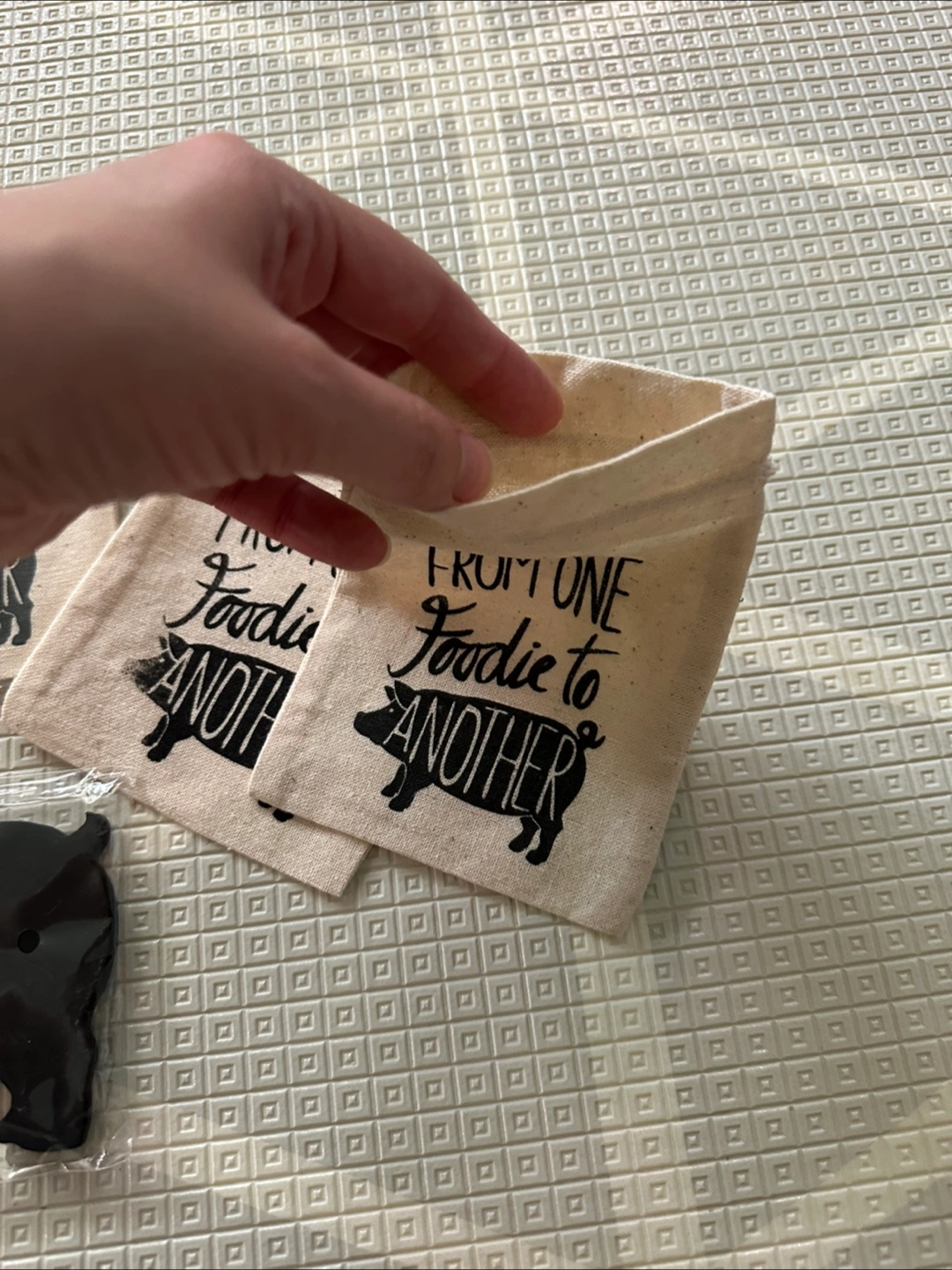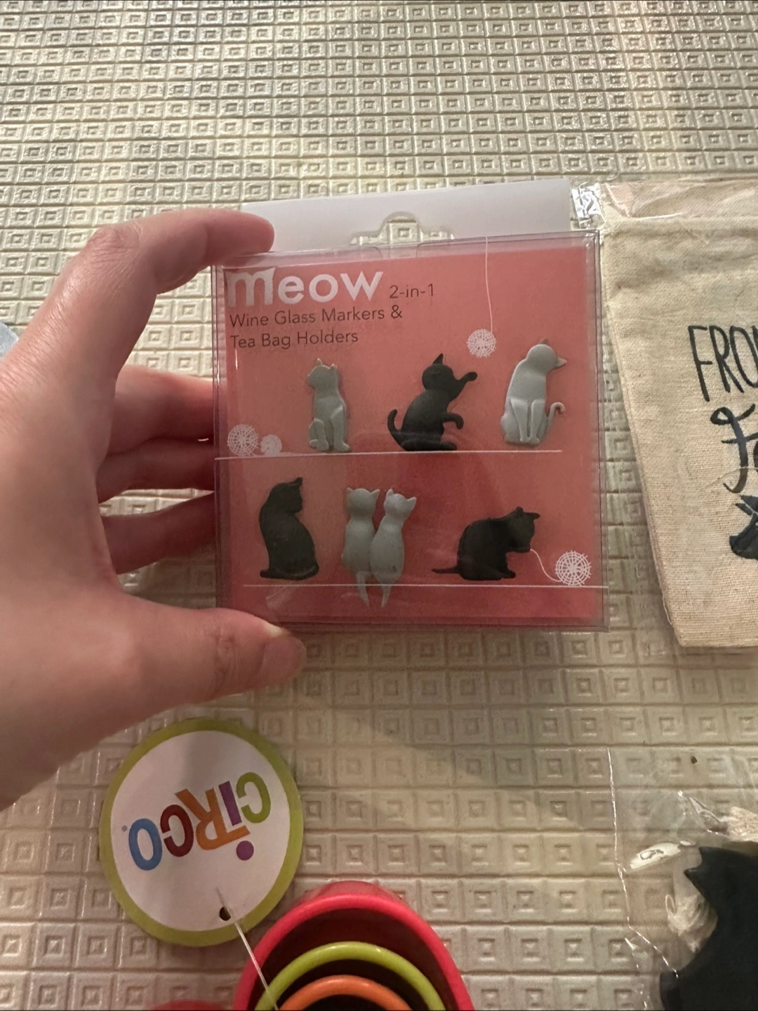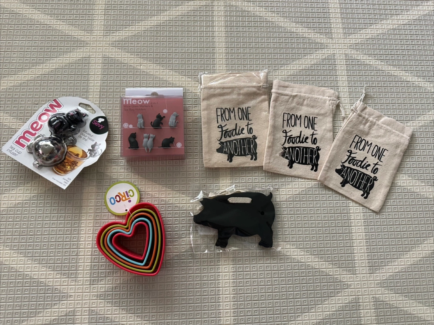 Included a black cat tea infuser, set of silicone cat glass markers, set of heart cookie cutters, cotton baggies and two pig chalk board labels. All items brand new never used. Smoke free home.