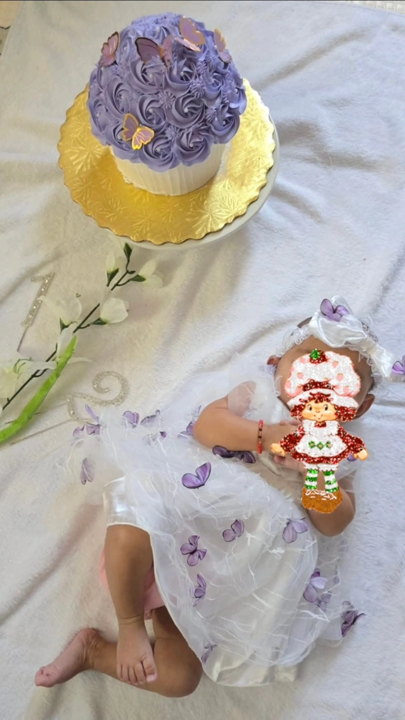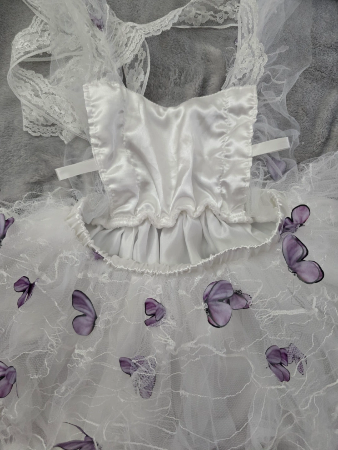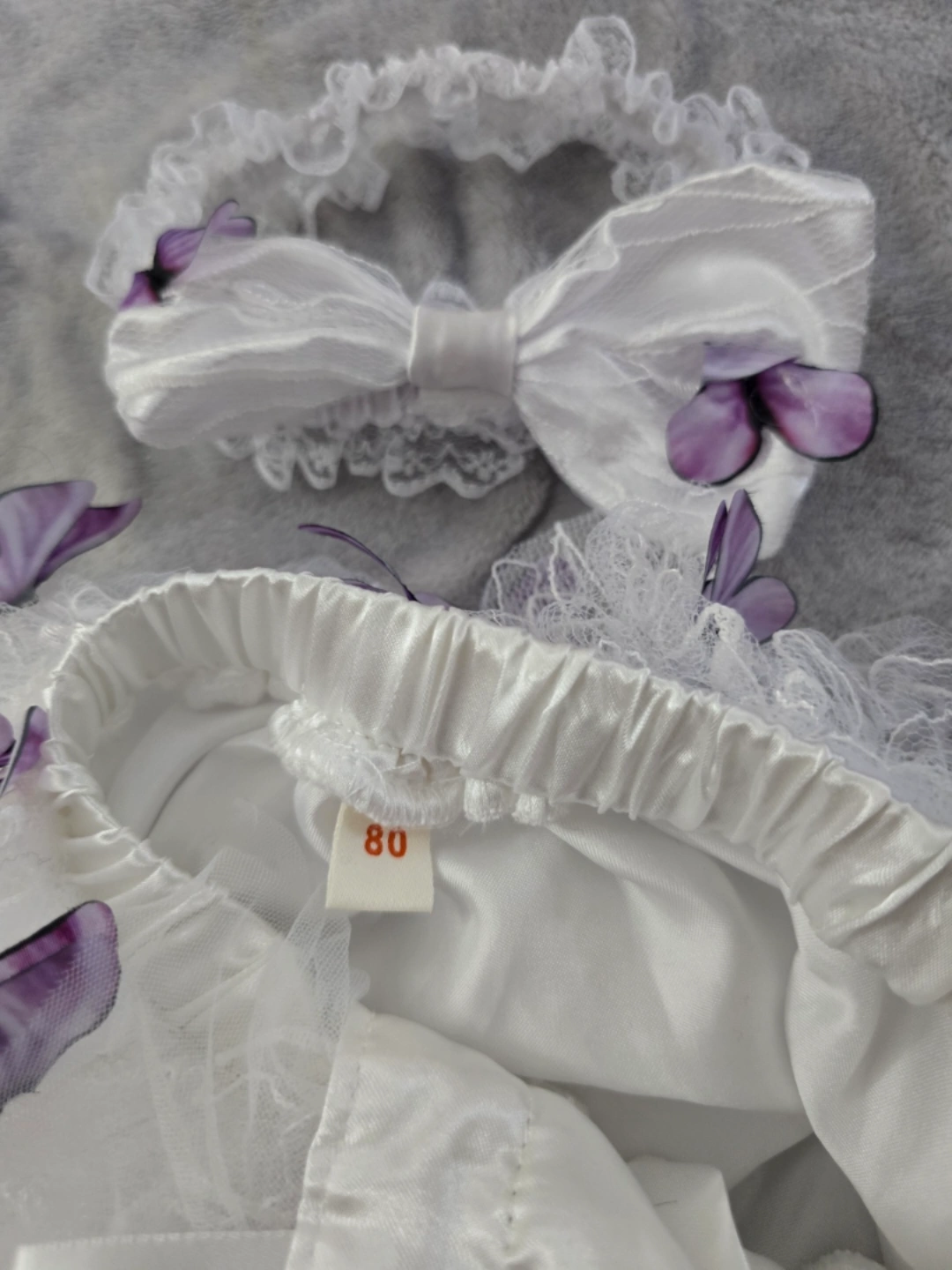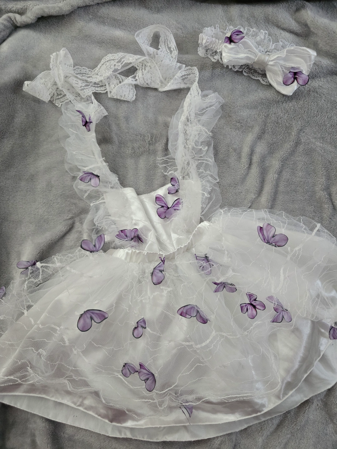White tulle dress with purple butterfly accents. Matching headband. Size 80. Perfect for a special occasion.