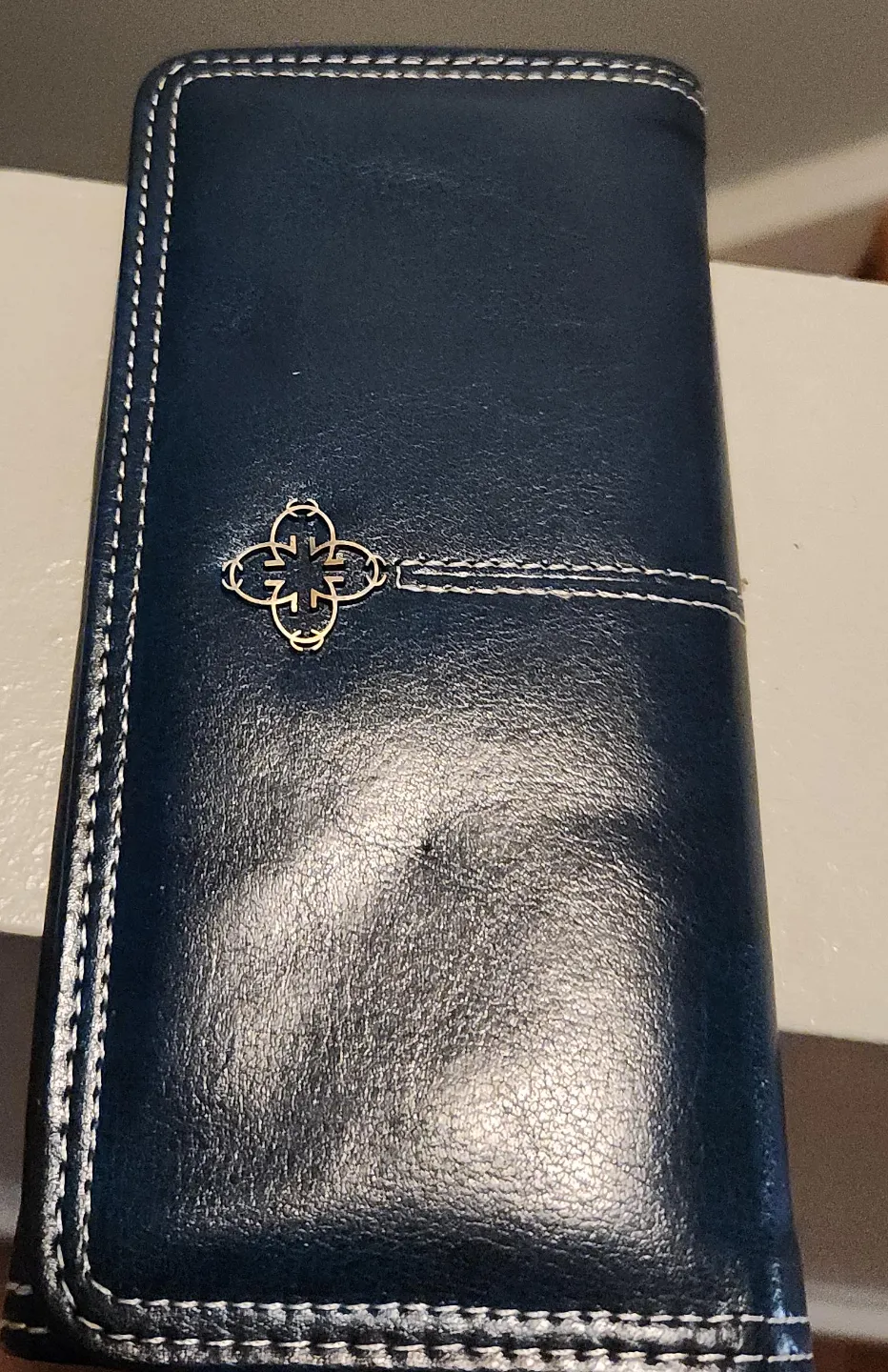 Long navy blue leather like wallet. Features decorative metal detail. Stitching detail around edges.