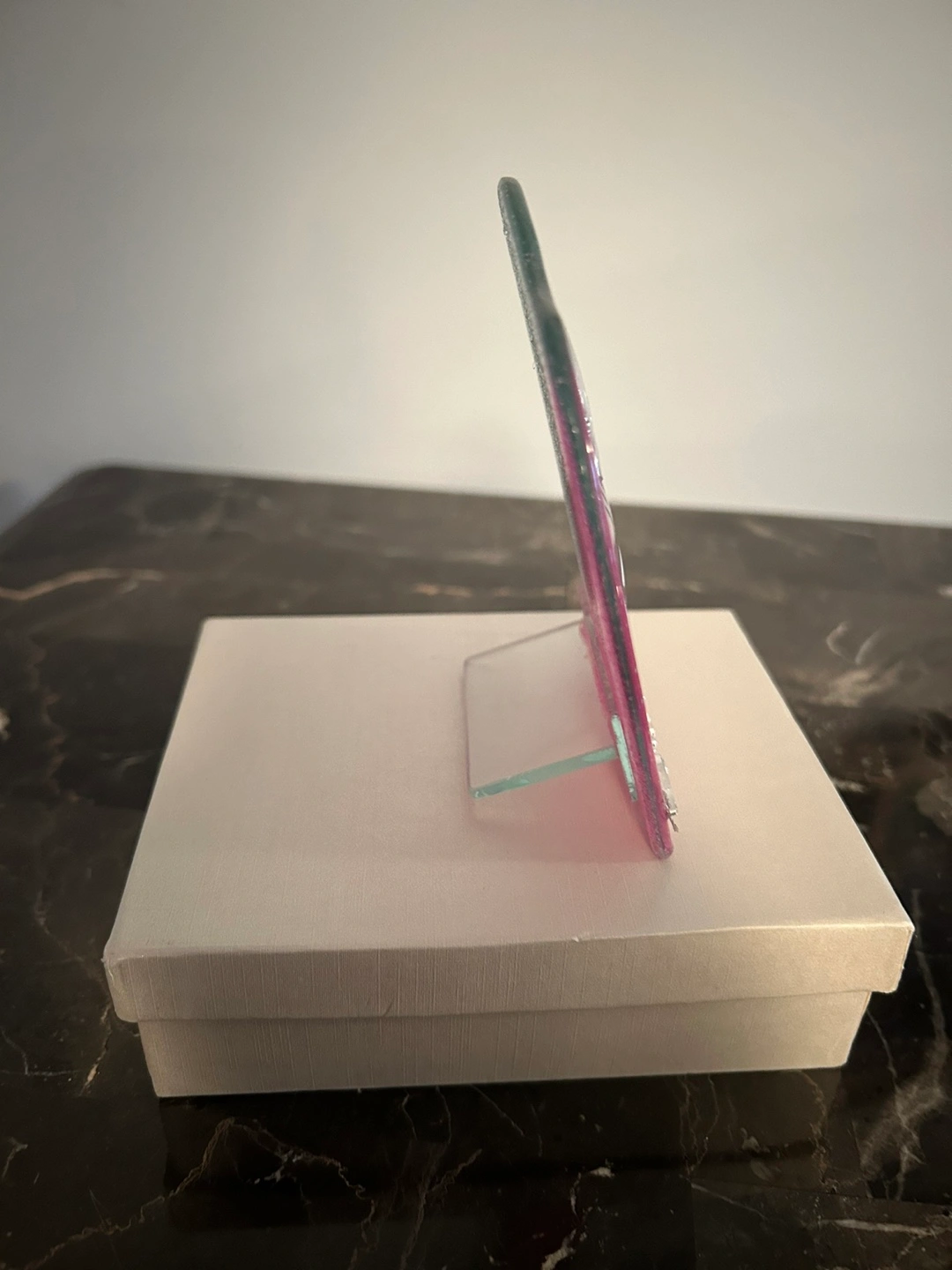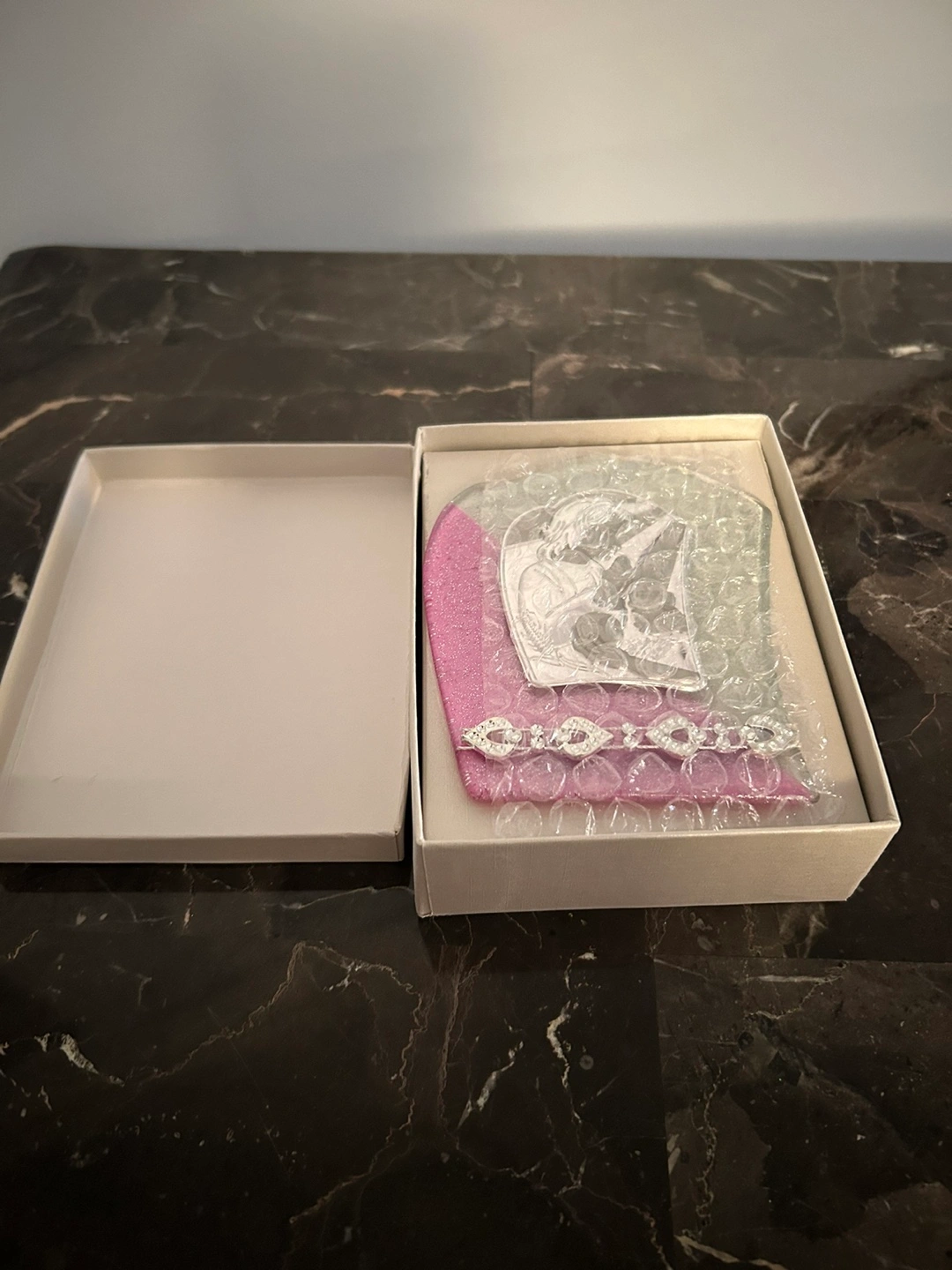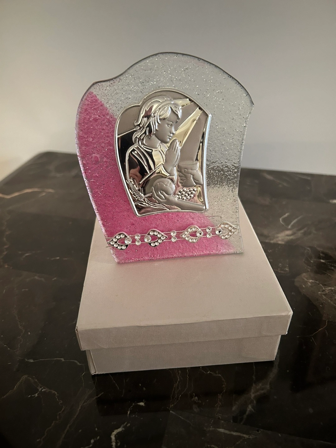Beautiful keepsake for First Communion. Features a silver image of a praying child on a pink and clear glass plaque. Small crystals adorn the bottom. Comes in a white gift box. Perfect gift or memento.