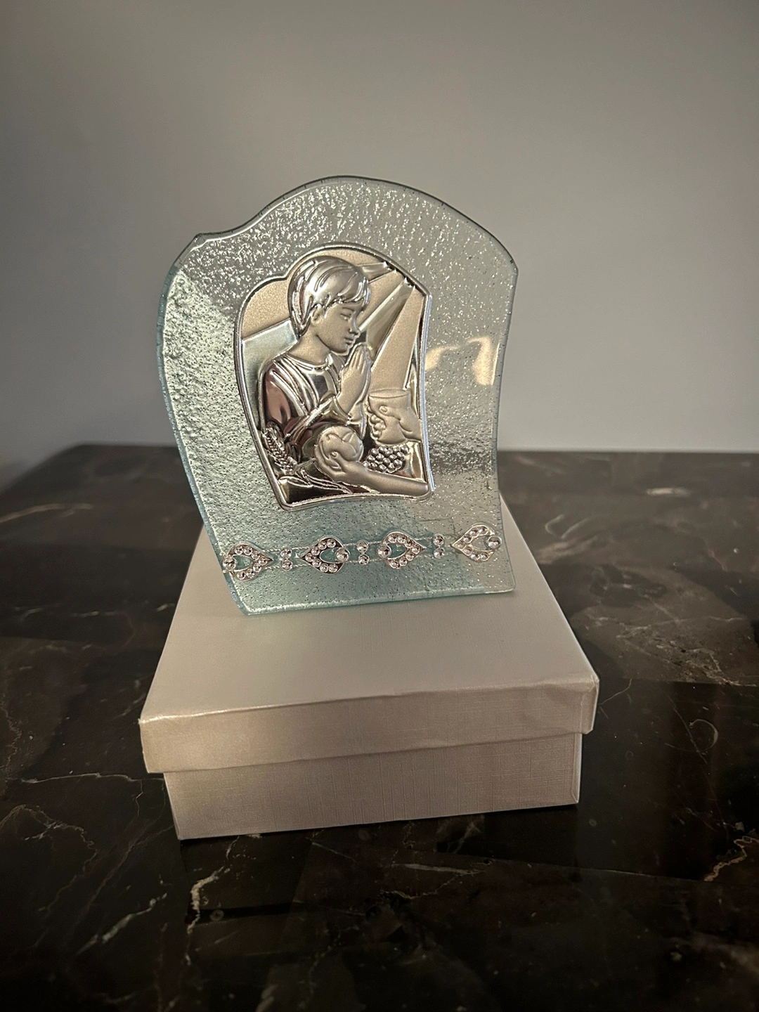 Beautiful keepsake for First Communion. Features a silver image of a praying child on a blue and clear glass plaque. Small crystals adorn the bottom. Comes in a white gift box. Perfect gift or memento.