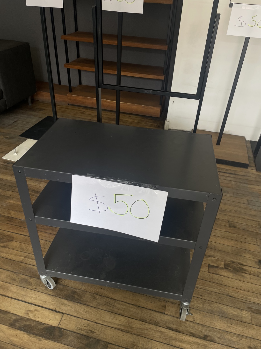 1 / 11 / 1Buy & SellMetal rolling cart - 3 shelvesMetal rolling cart - 3 shelves$50Three-shelf metal rolling cart. Dark grey finish. Good for storage or display. Wheels included.ConditionGoodWHERE TO MEETFrank and OakView MapSELLERverifiedLaraN St. James Town28722 reviews0 chats·0 favorites·20 viewsSEND CHAT TO SELLERHi Lara! I’m interested in your listing.Hi Lara! I’m interested in your listing.Get the Karrot app to chatSign In to chat