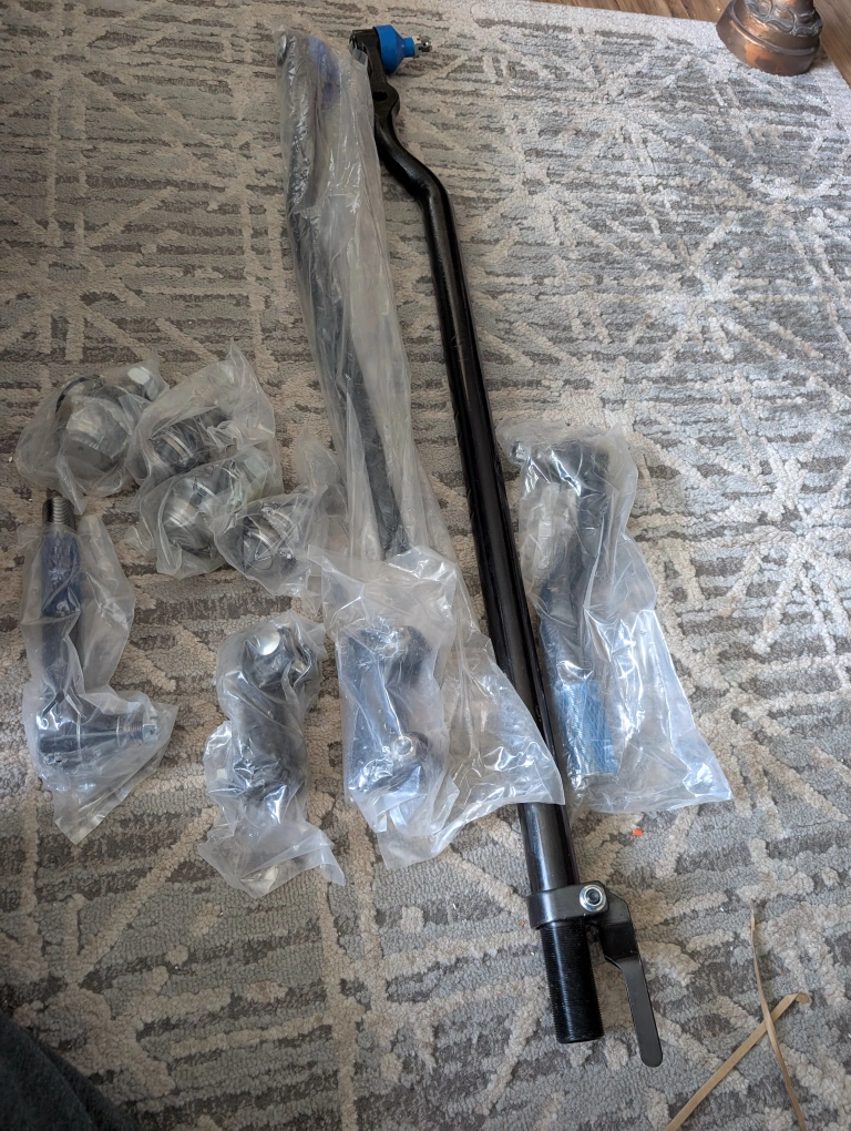 Complete steering linkage kit. Includes drag links, tie rod ends, ball joints, and adjusting sleeves. Brand new, still in packaging. A-Premium 10Pcs Front Suspension Kit, Ball Joint Tie Rod End Compatible with Ford F-250 Super Duty/F-350 Super Duty 1999-2004, Excursion 2000-2005 See photos for parts included.OBO