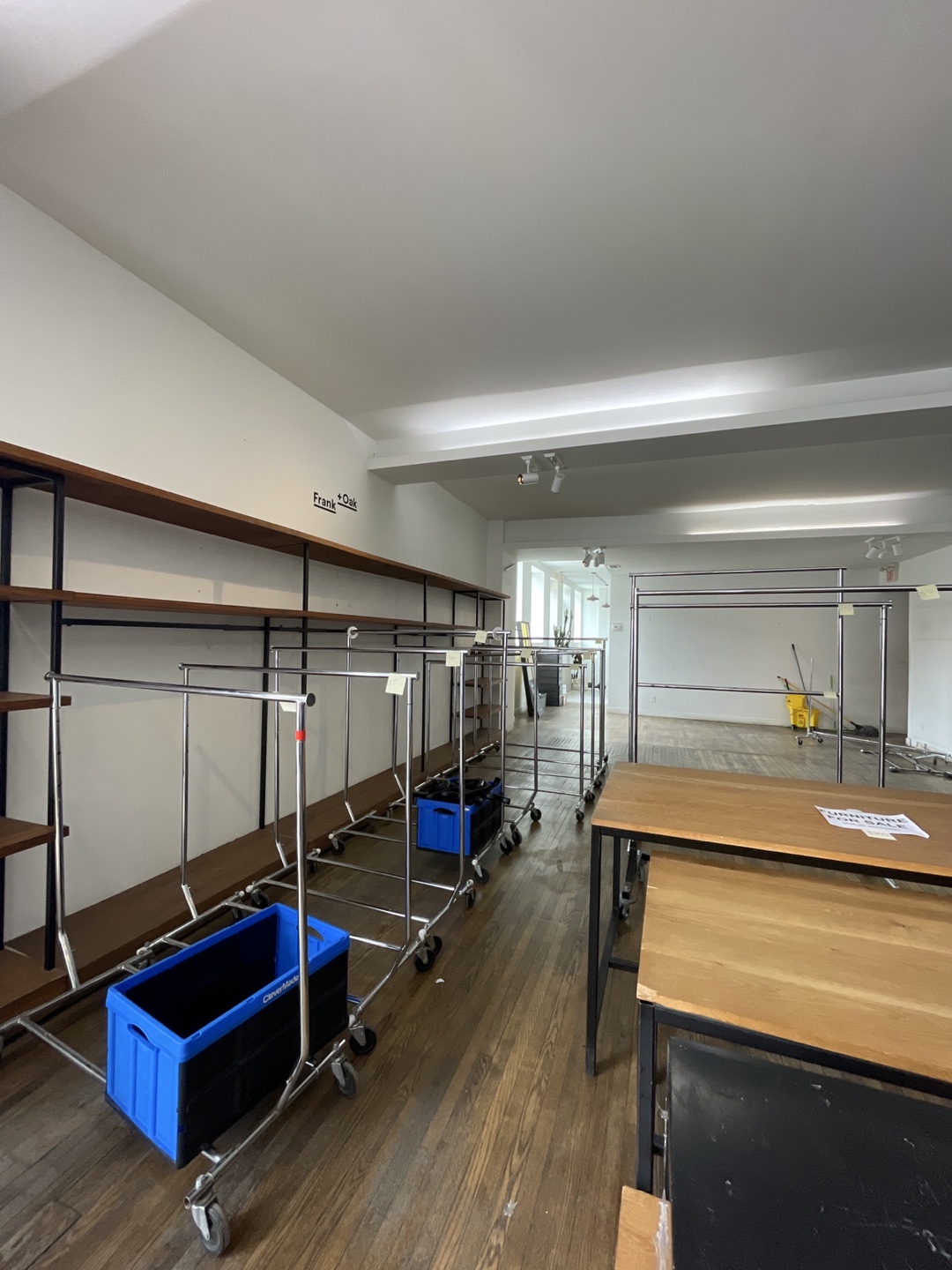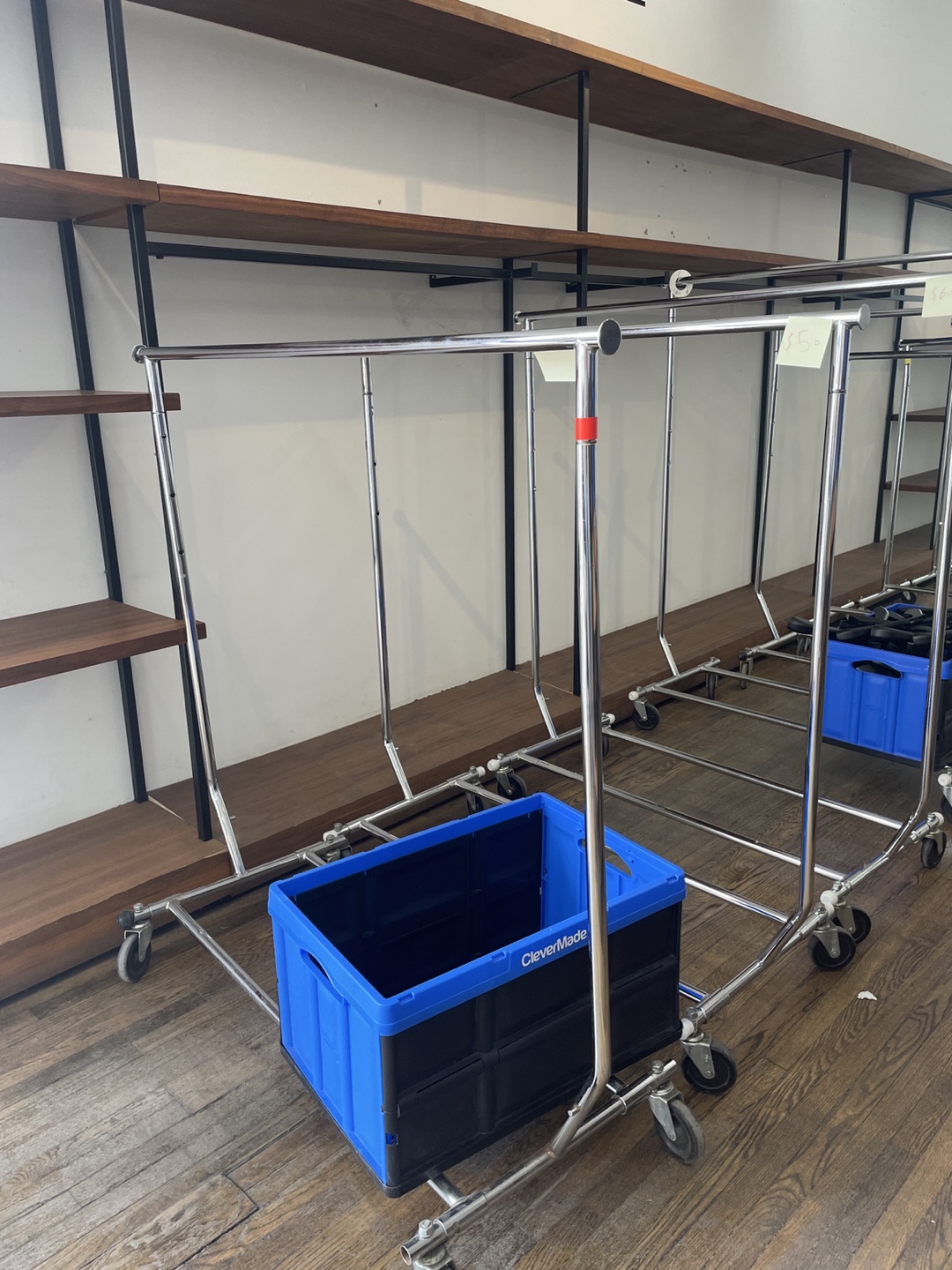 Clothing rolling racks on wheels. Each rack includes a blue CleverMade collapsible storage bin. Great for retail or home use. Some minor wear.