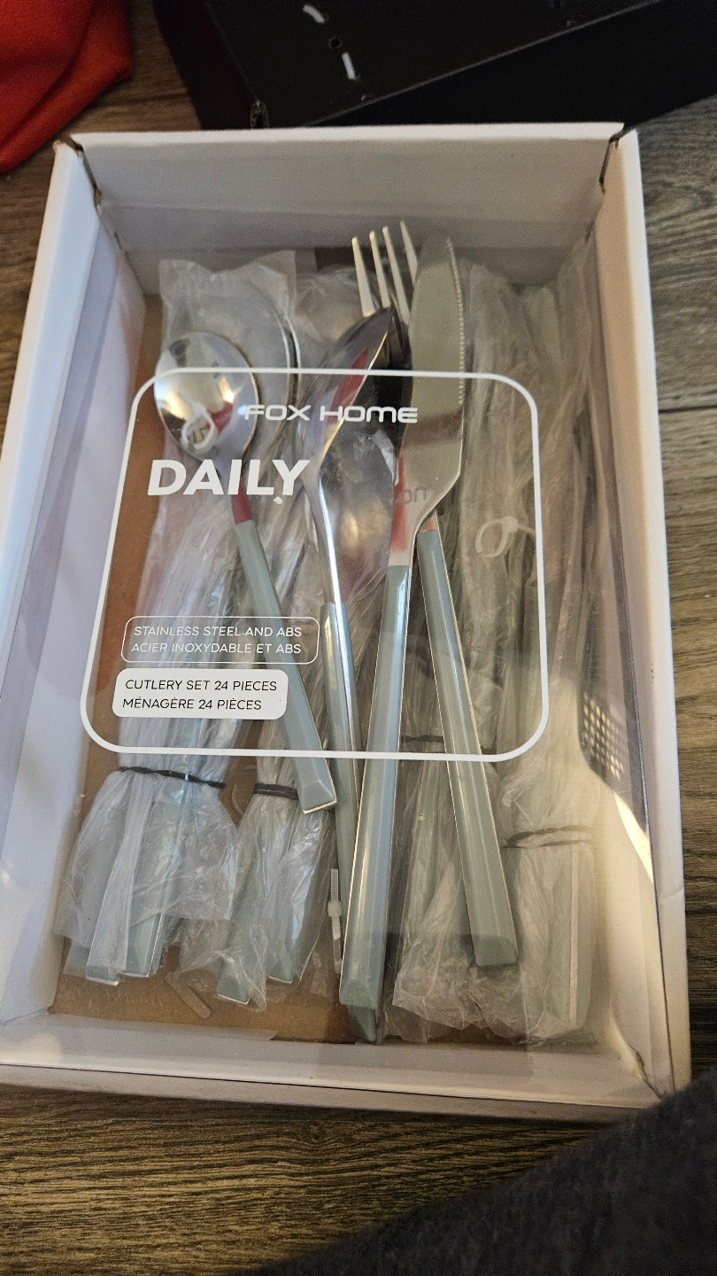 I purchased this 24 piece cutlery set from Fox Home in the eatons centre couple days ago. It currently retails for $55.97, link below. Box opened but brand new, never used, with cute blue handles.