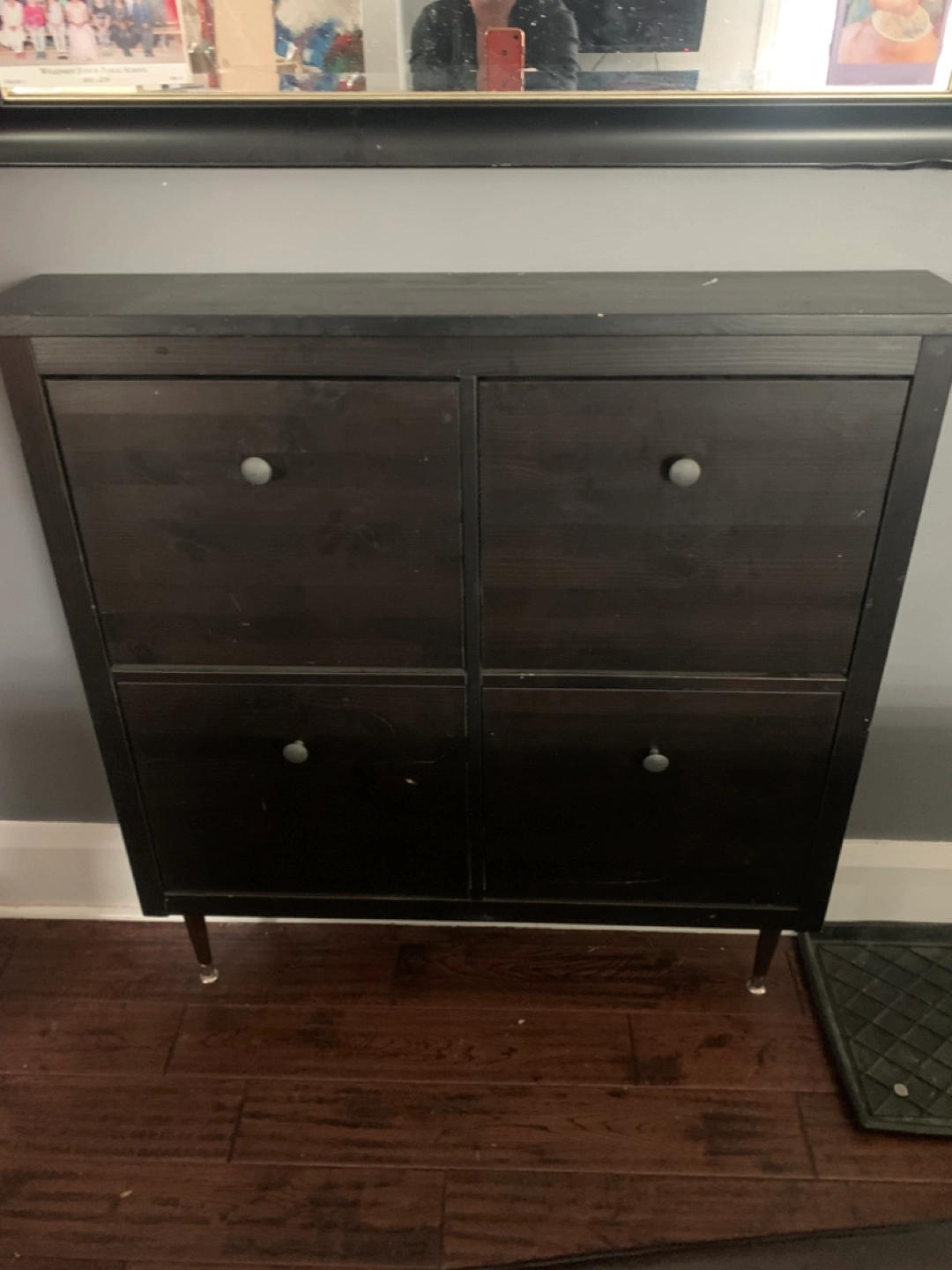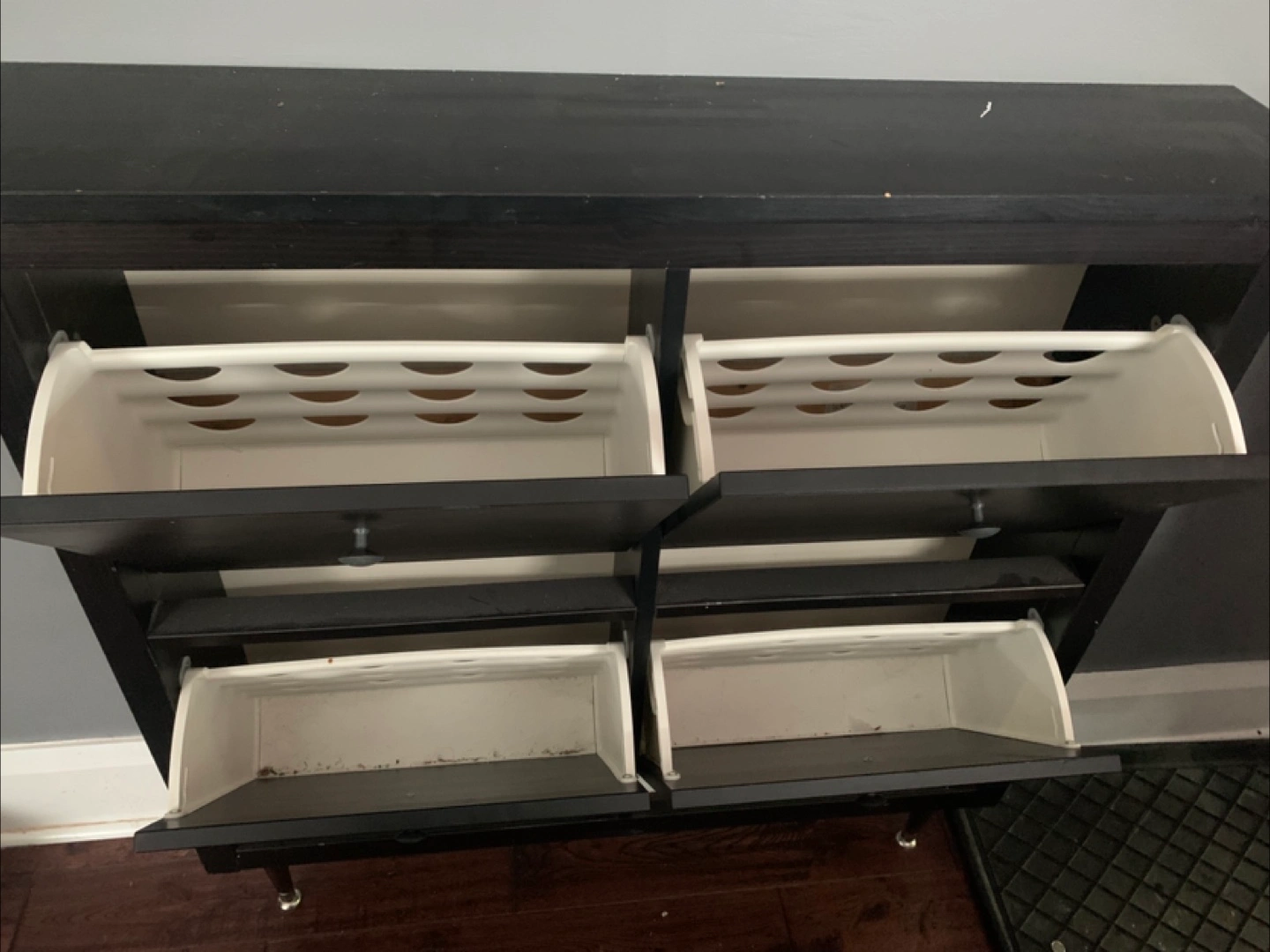 Four-compartment shoe cabinet. Black finish. Small, white plastic drawers. Good for entryway storage.