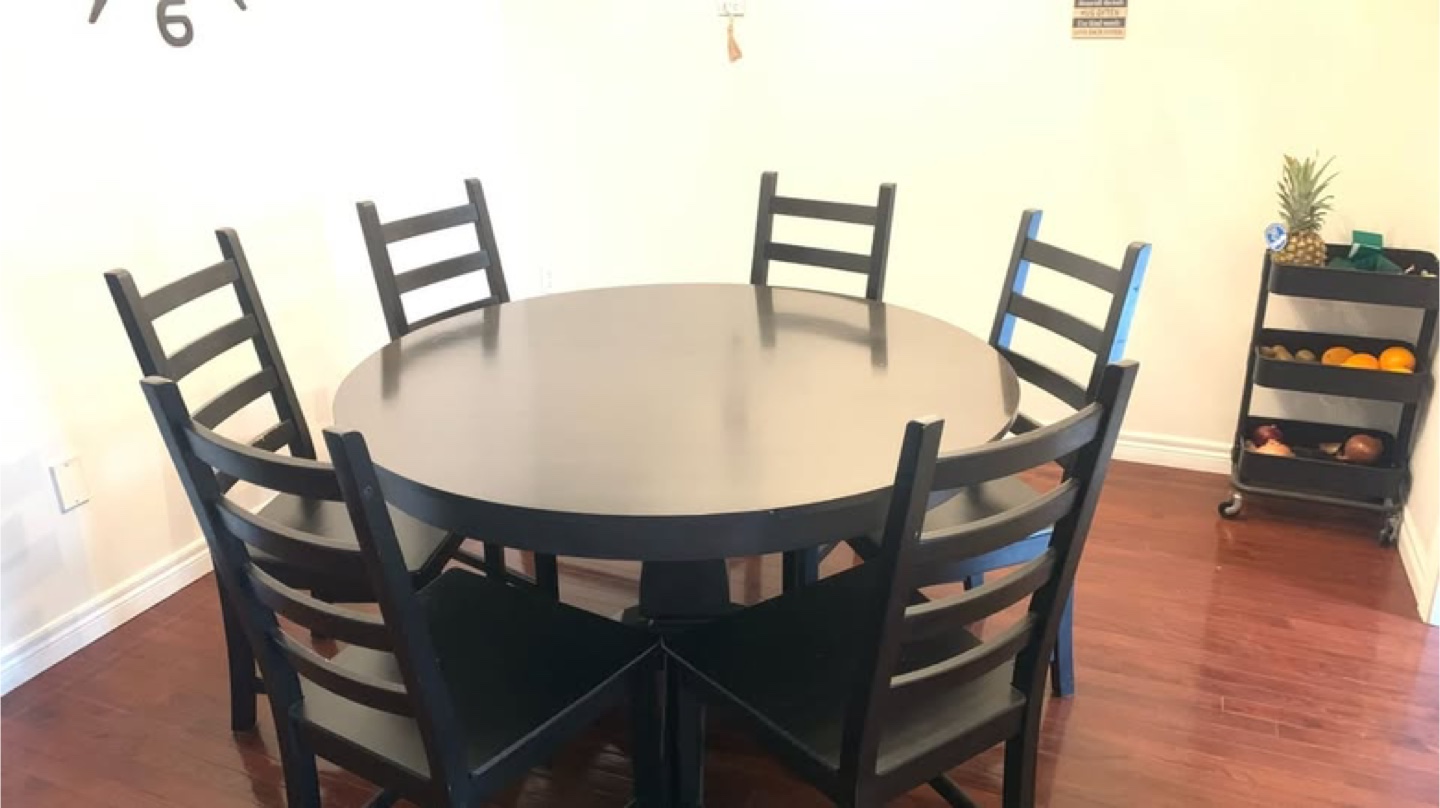 Beautiful dark brown round dining table. Table diameter approximately 50 inches. Perfect for smaller spaces. Solid wood construction.