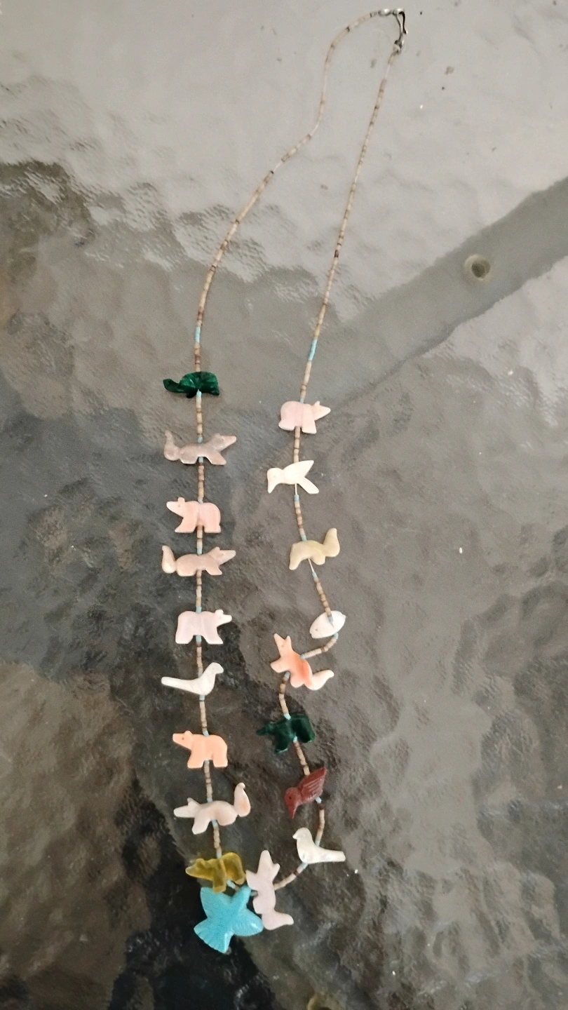 Unique necklace featuring various carved stone animals. Beige seed beads separate each charm. Silver clasp.