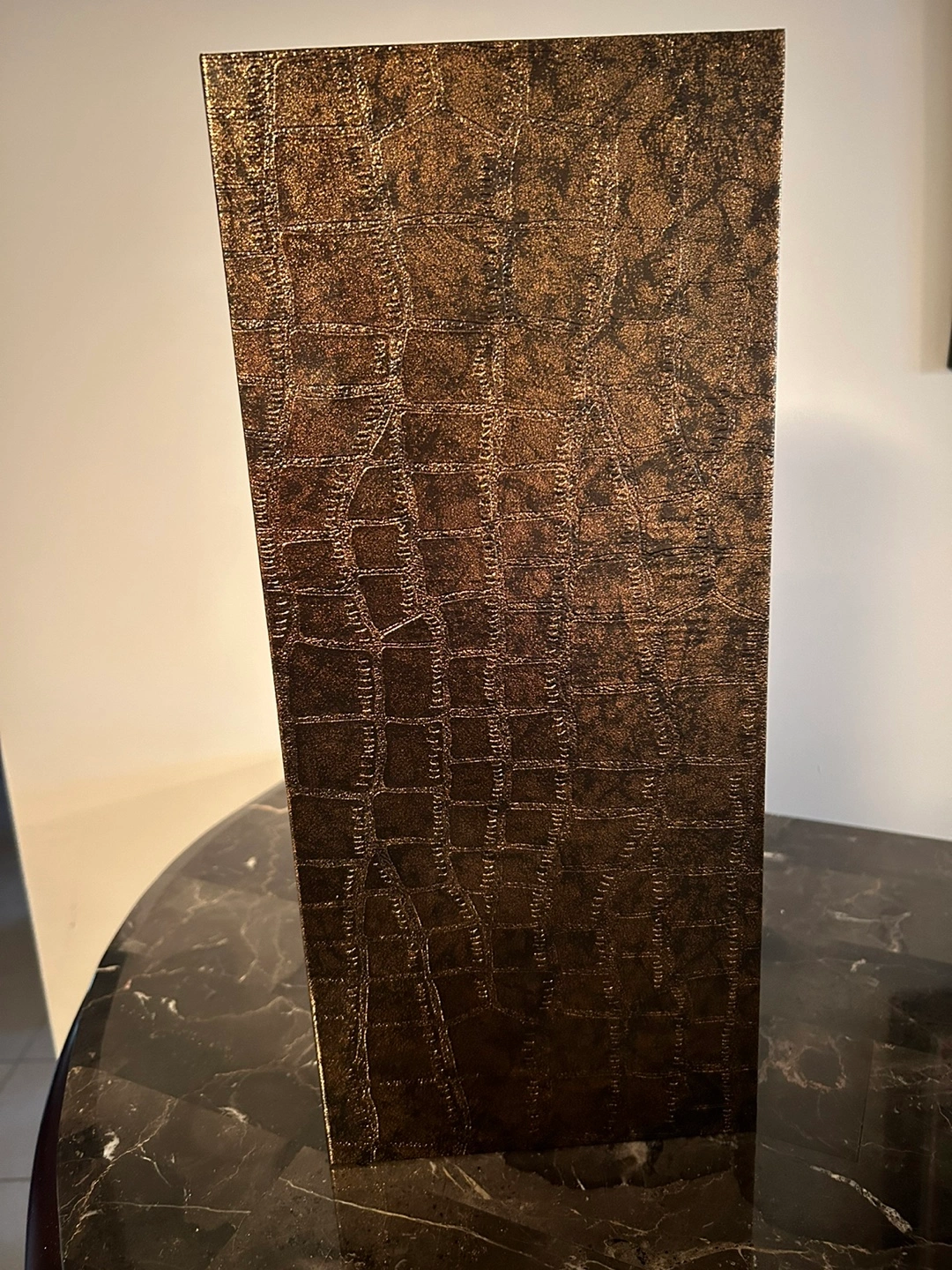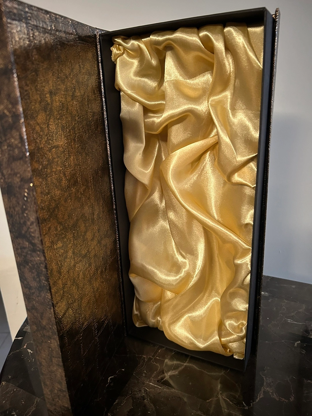 Elegant rectangular box. Dark brown crocodile-embossed exterior. Soft gold satin lining. Ideal for 2 bottles of Ice Wine.