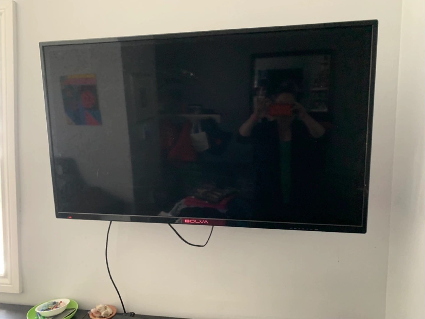 Wall-mounted flat-screen TV. Sleek design. Includes power cord and wall mount if buyer can remove from wall. Buyer needs to take down themselves.