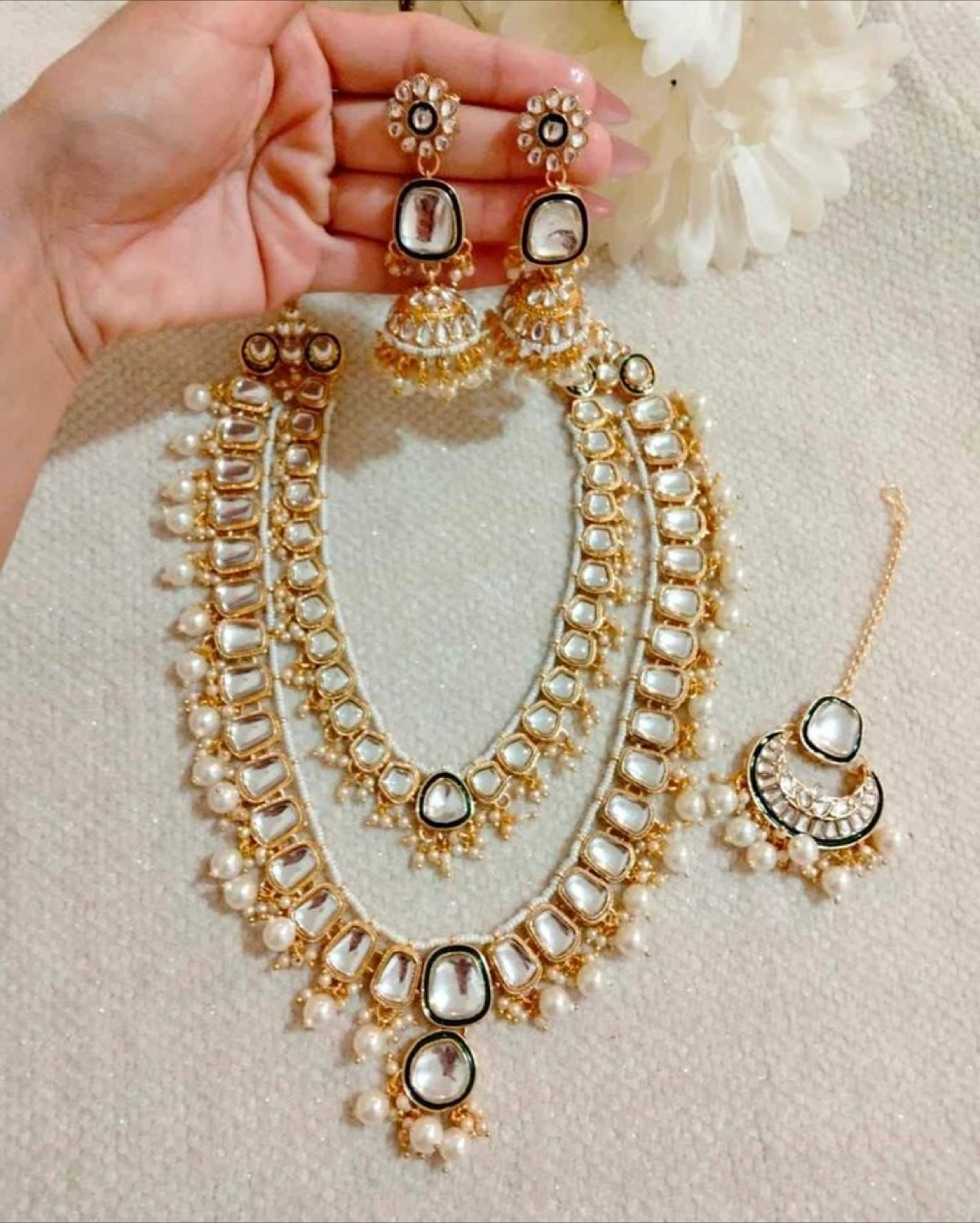 Beautiful three-strand necklace set. Features kundan stones, pearls, and gold accents. Includes matching earrings and maang tikka. Perfect for special occasions.