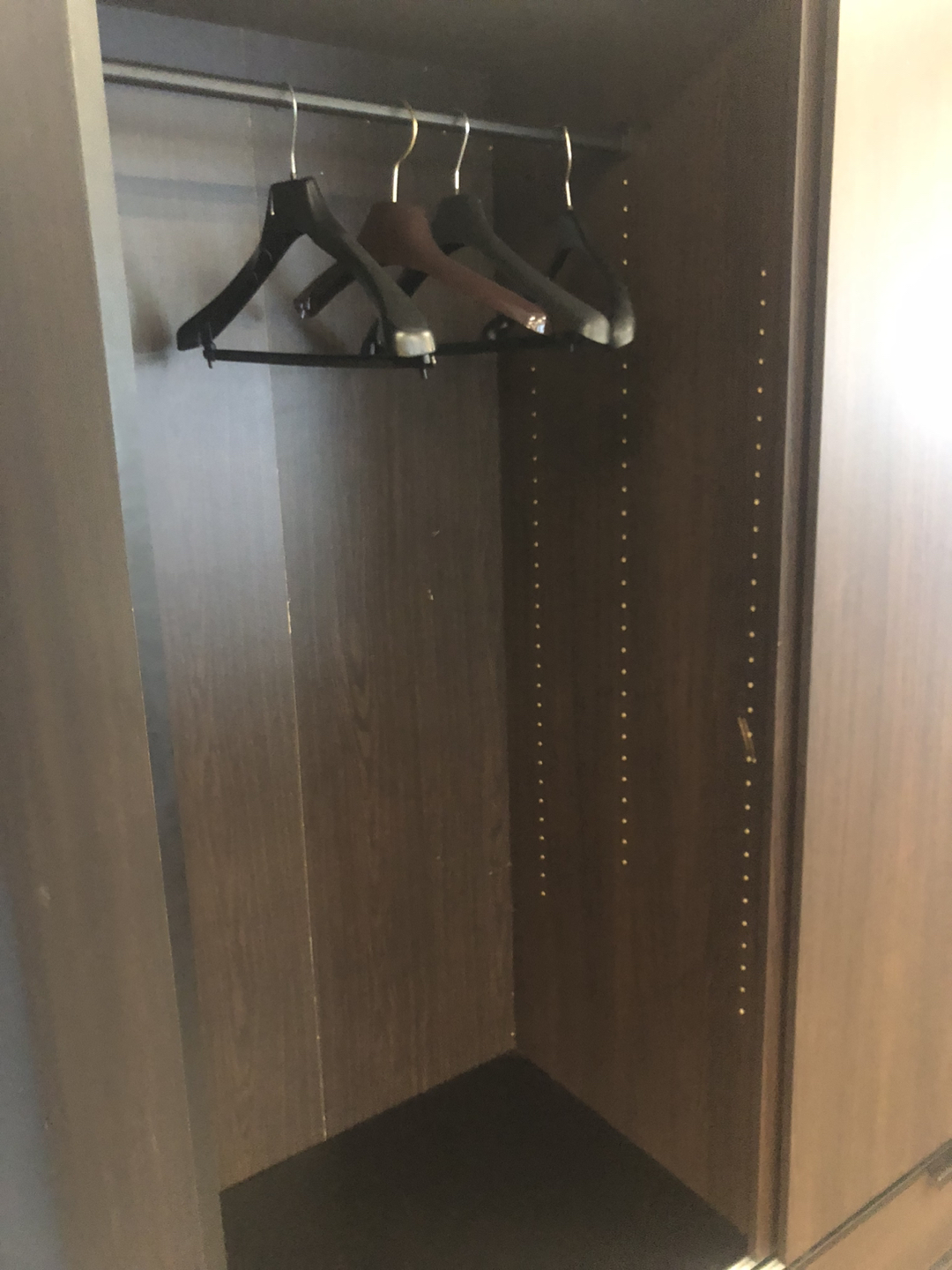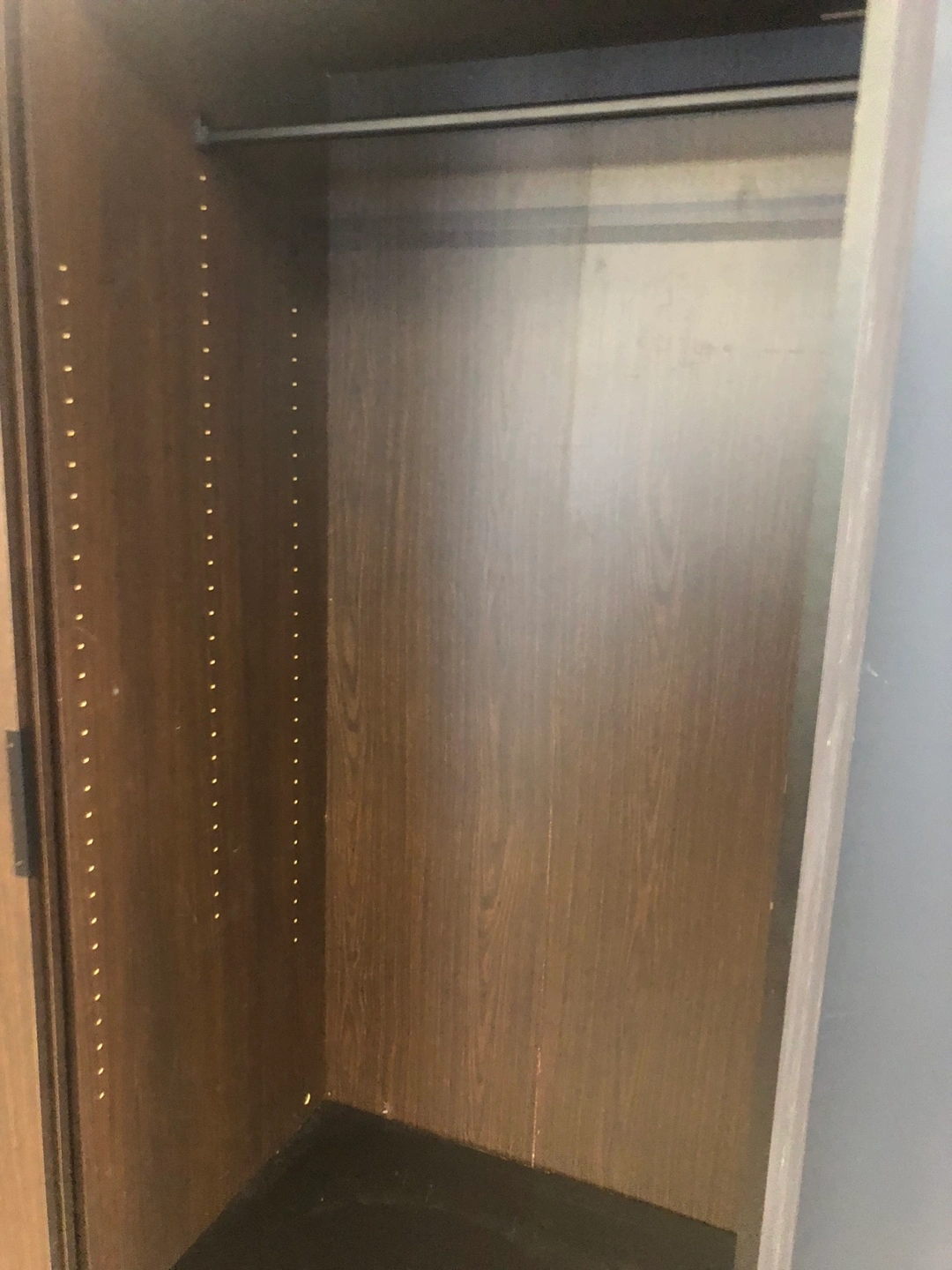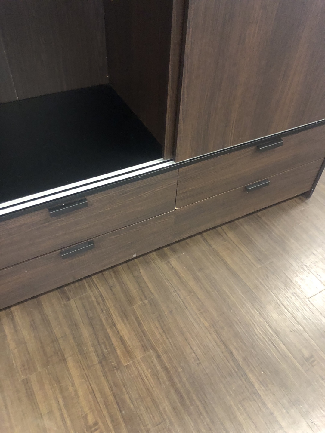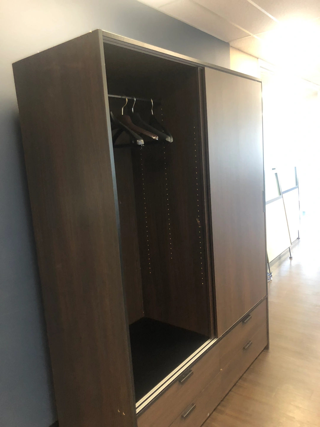 Wardrobe closet with hanging rods on each side and 4 drawers. Sliding doors. Some damage inside of closet as seen in last photo. Item was lightly used in an office. Due to downsizing it must go. Available for pick up only.