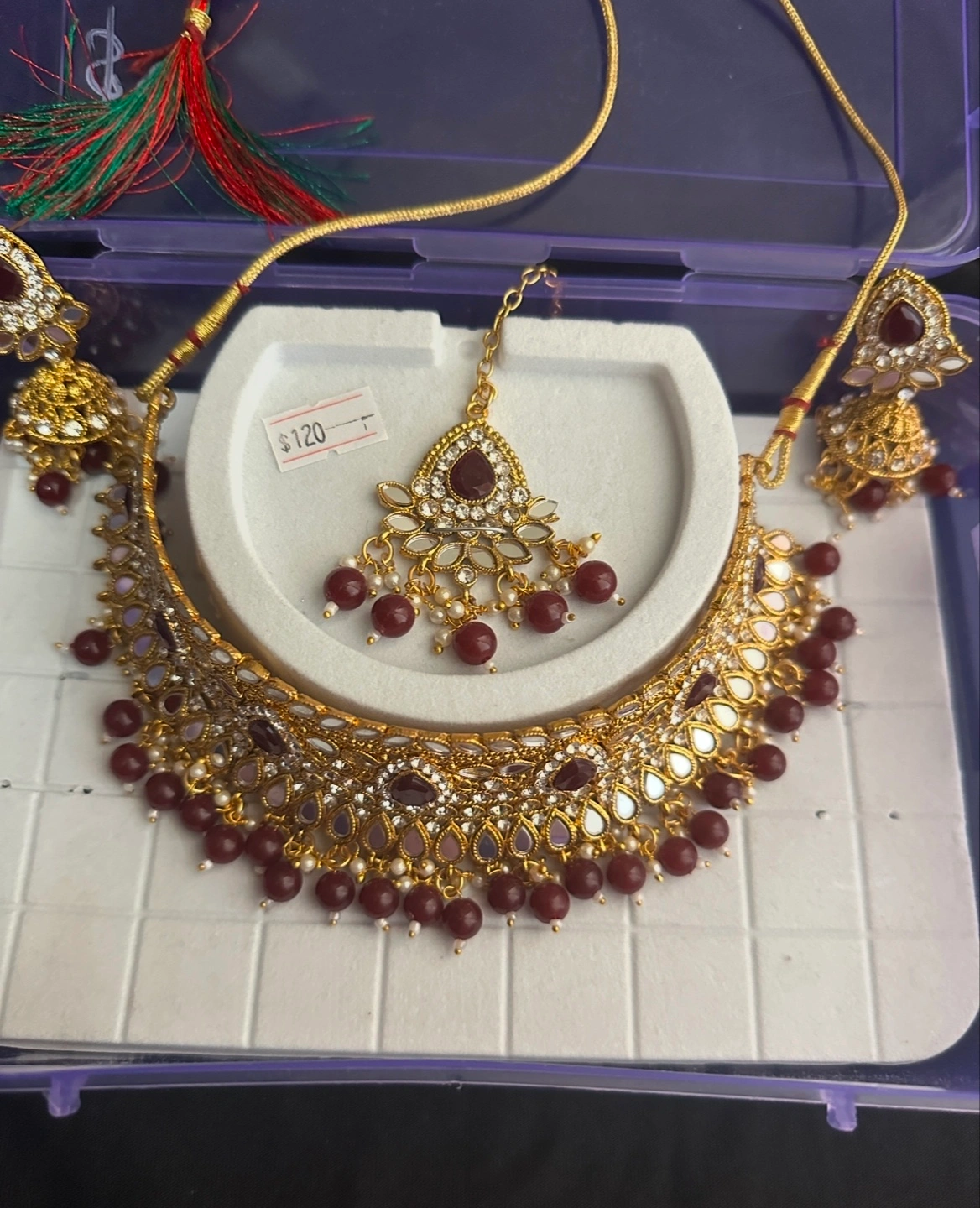 Stunning necklace set. Features maroon beads, gold accents, and clear stones. Includes matching earrings and maang tikka. Beautiful and intricate design. Perfect for weddings or special occasions.