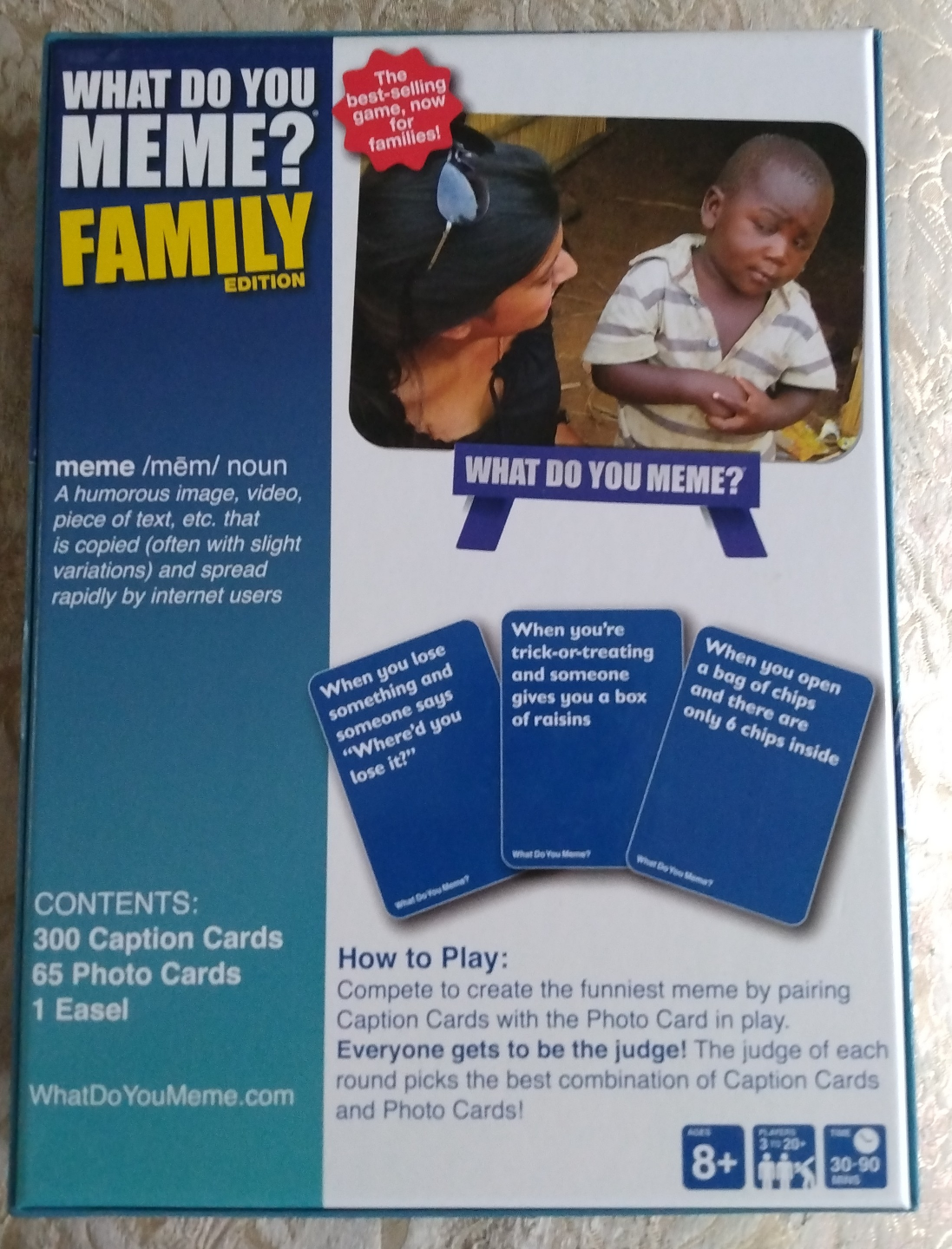 Family-friendly meme-matching game. Includes 300 caption cards, 65 photo cards, and 1 easel. Create the funniest meme by pairing captions with photos. Great for family game night. Ages 8+