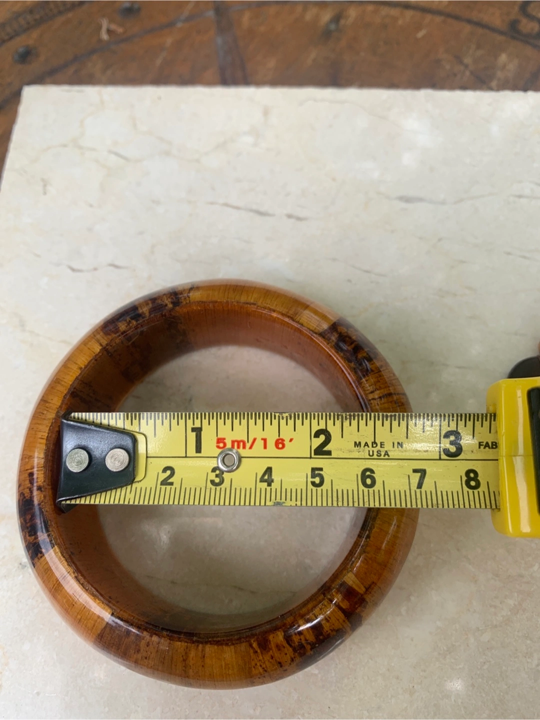 Stunning statement bangle! Features a wide, polished wooden brown/golden brown bangle with dark brown stripes. Perfect for adding a touch of bohemian chic to your look! NOTE: The earrings have been sold. Cash only please.