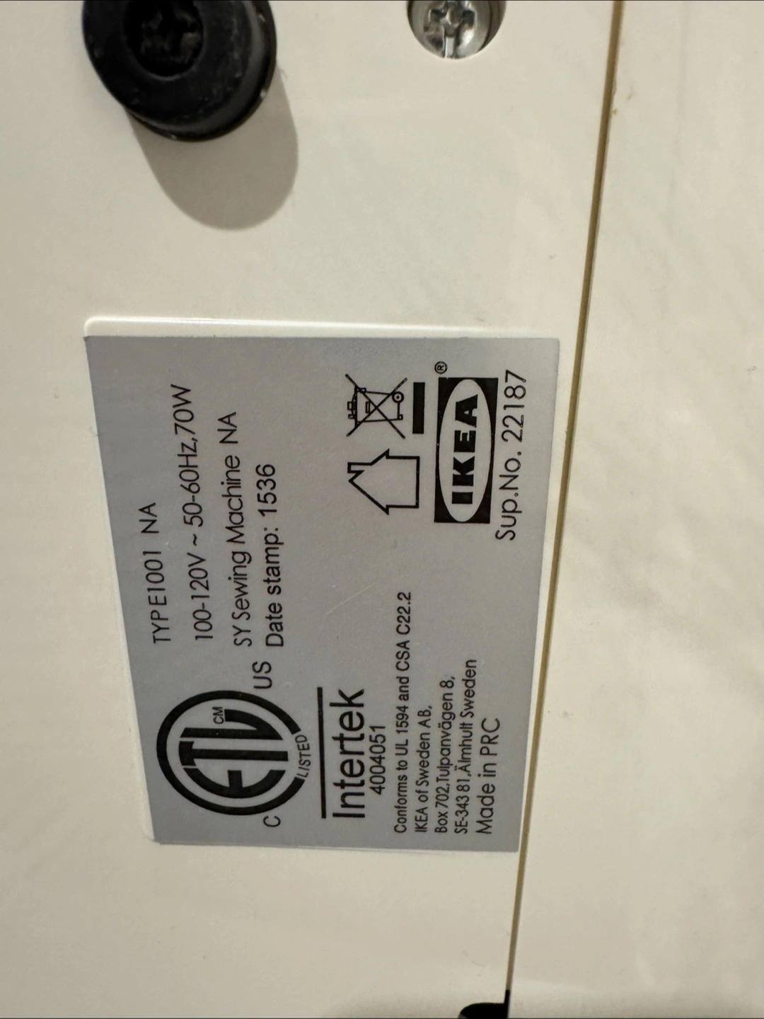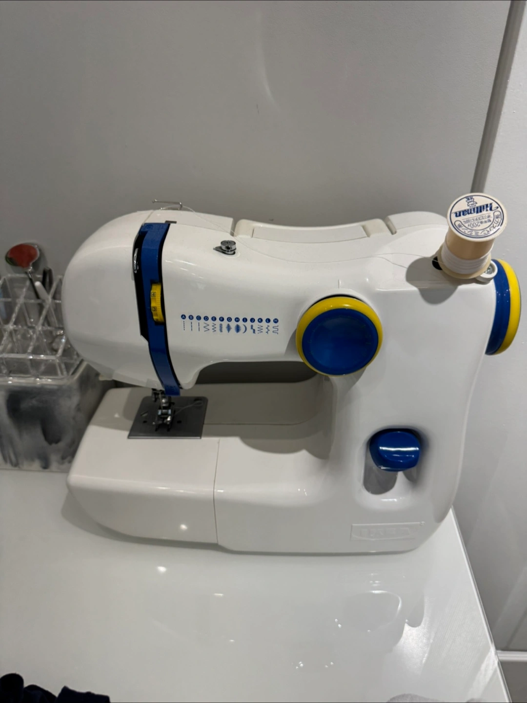 Compact and portable sewing machine. White with blue accents. Includes foot pedal. Great for beginners or small projects.