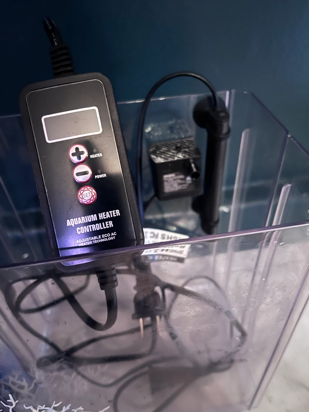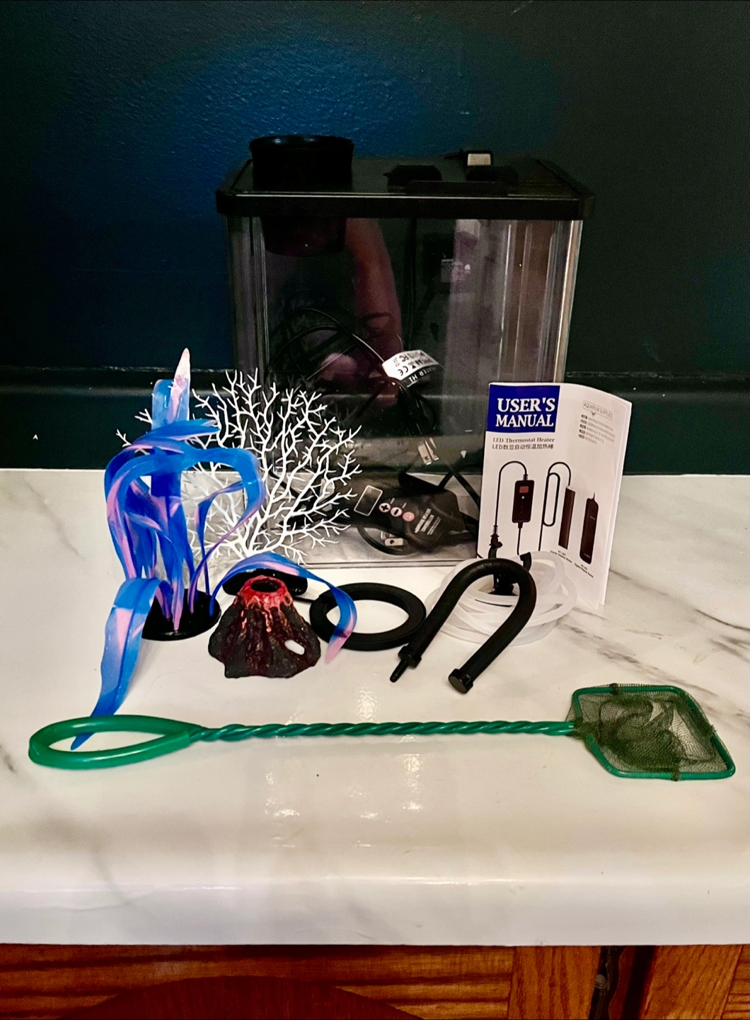 Small aquarium kit, includes: 10x9x6 inch tank, heater with controller, air pump with tubing, decor, floating food catcher, and net. Not pictured is black film to keep direct light out.