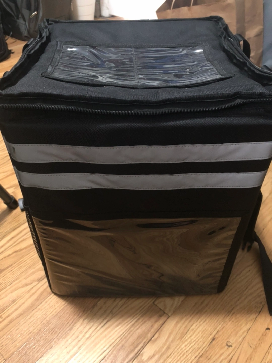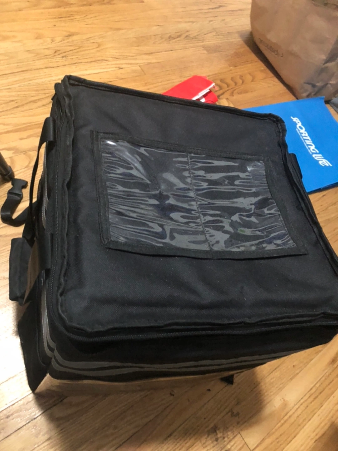 Large capacity insulated delivery bag. Features two compartments and a clear ID window. Durable construction with reinforced carrying handles. Keeps food warm or cold.