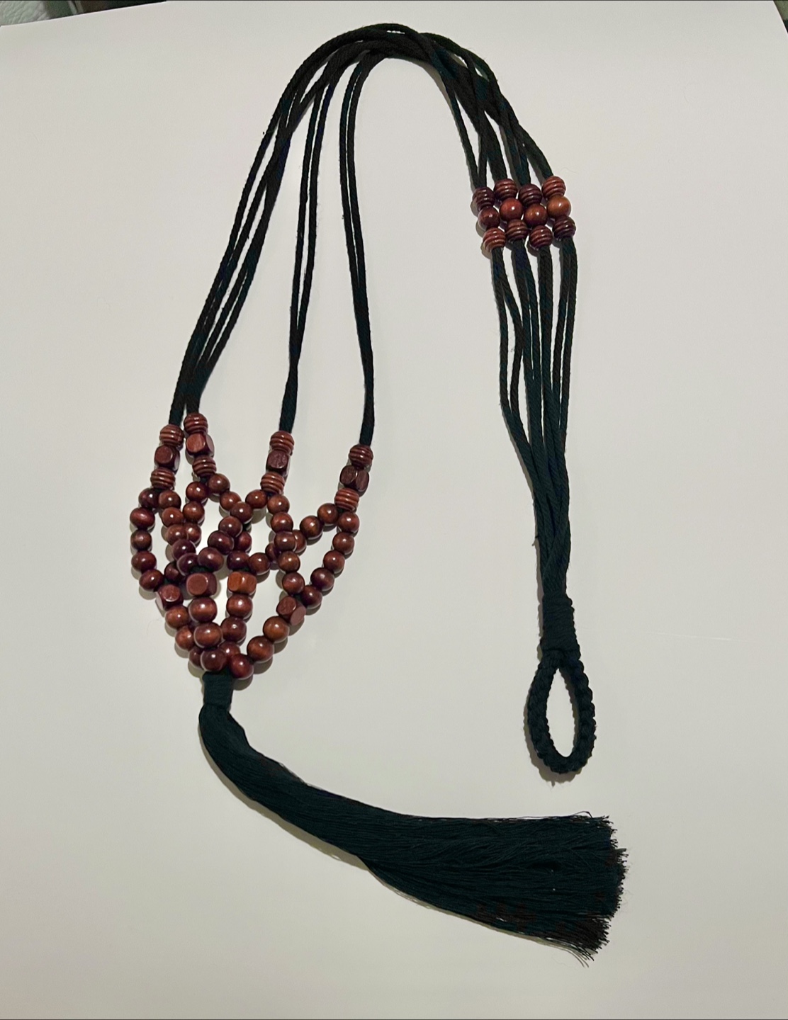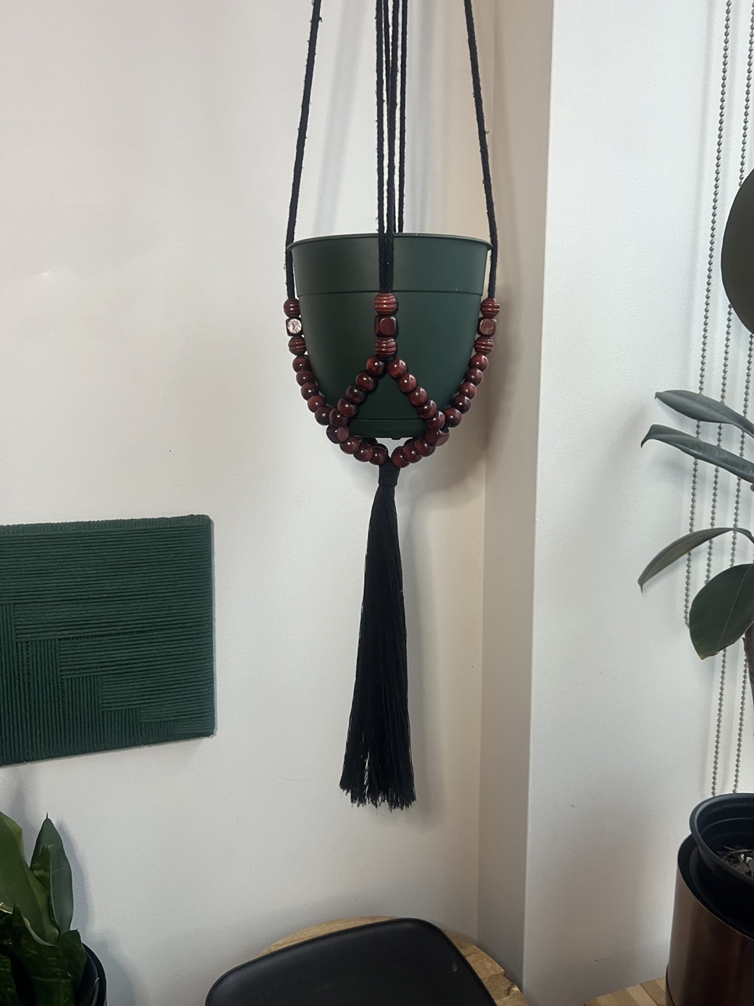 Handmade macrame plant hanger. Made with black cotton cord, accented with cherry wood beads and a long tassel. Perfect for adding a bohemian touch to your home decor. Holds medium to large pots.