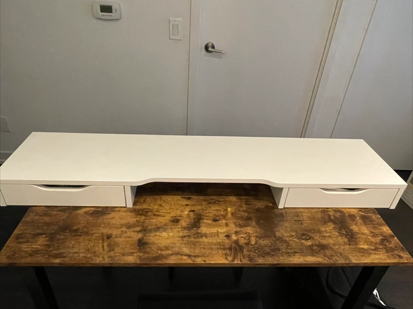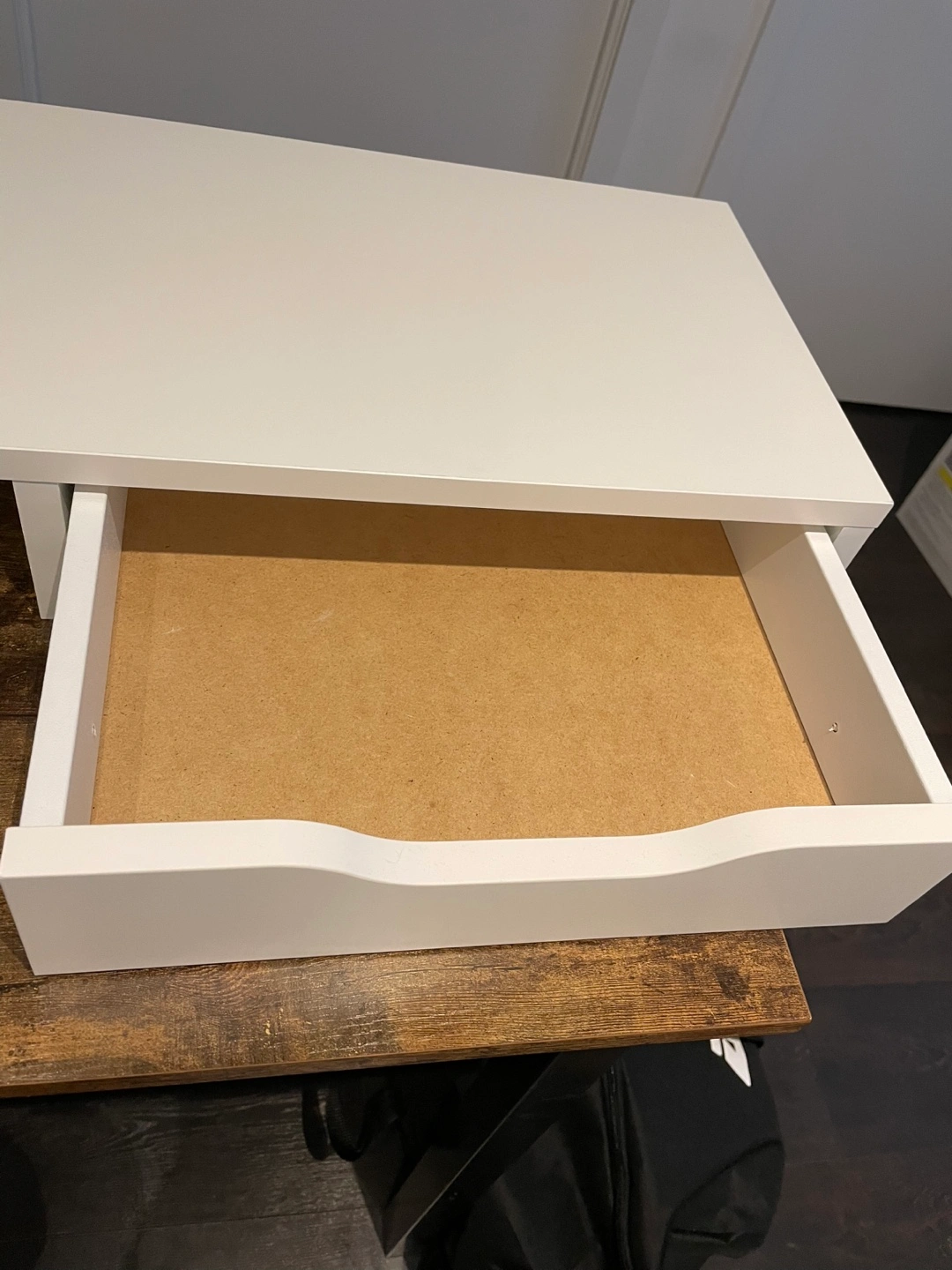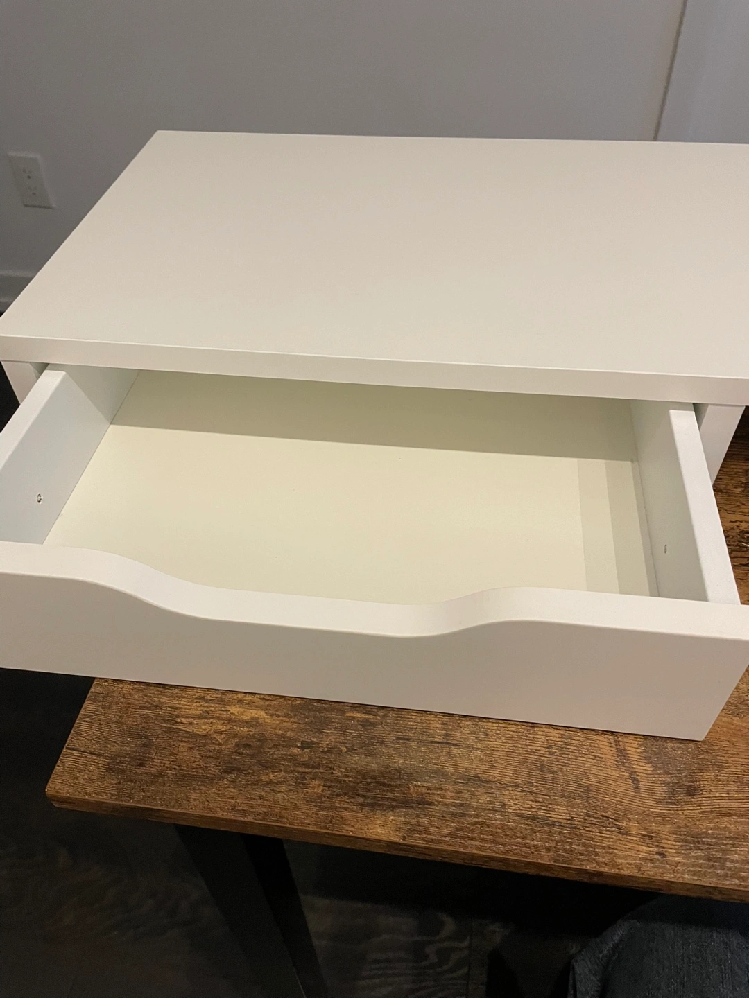 White laptop stand with two drawers – great for small spaces. Features a clean, minimalist design. No damage and very clean overall. Please note: the bottom panel of one drawer was installed upside down (see photos for details).