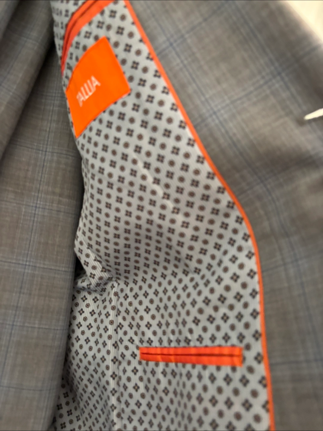 Men's suit, grey windowpane pattern. Two-button jacket. Includes matching pants. Lined jacket.
