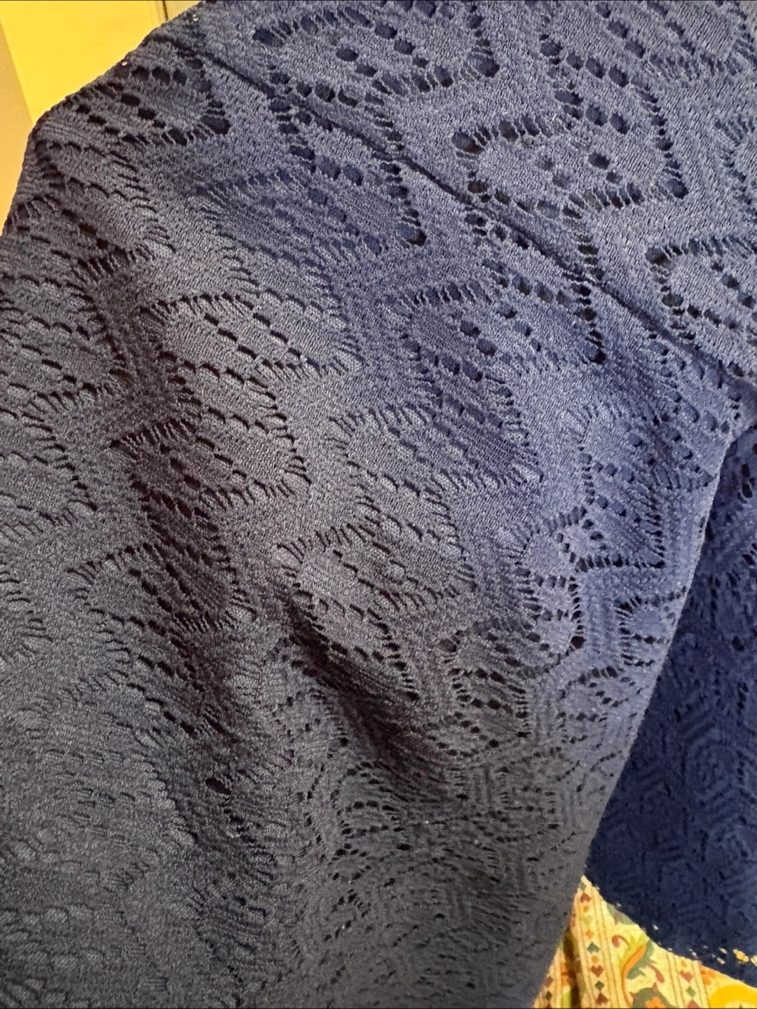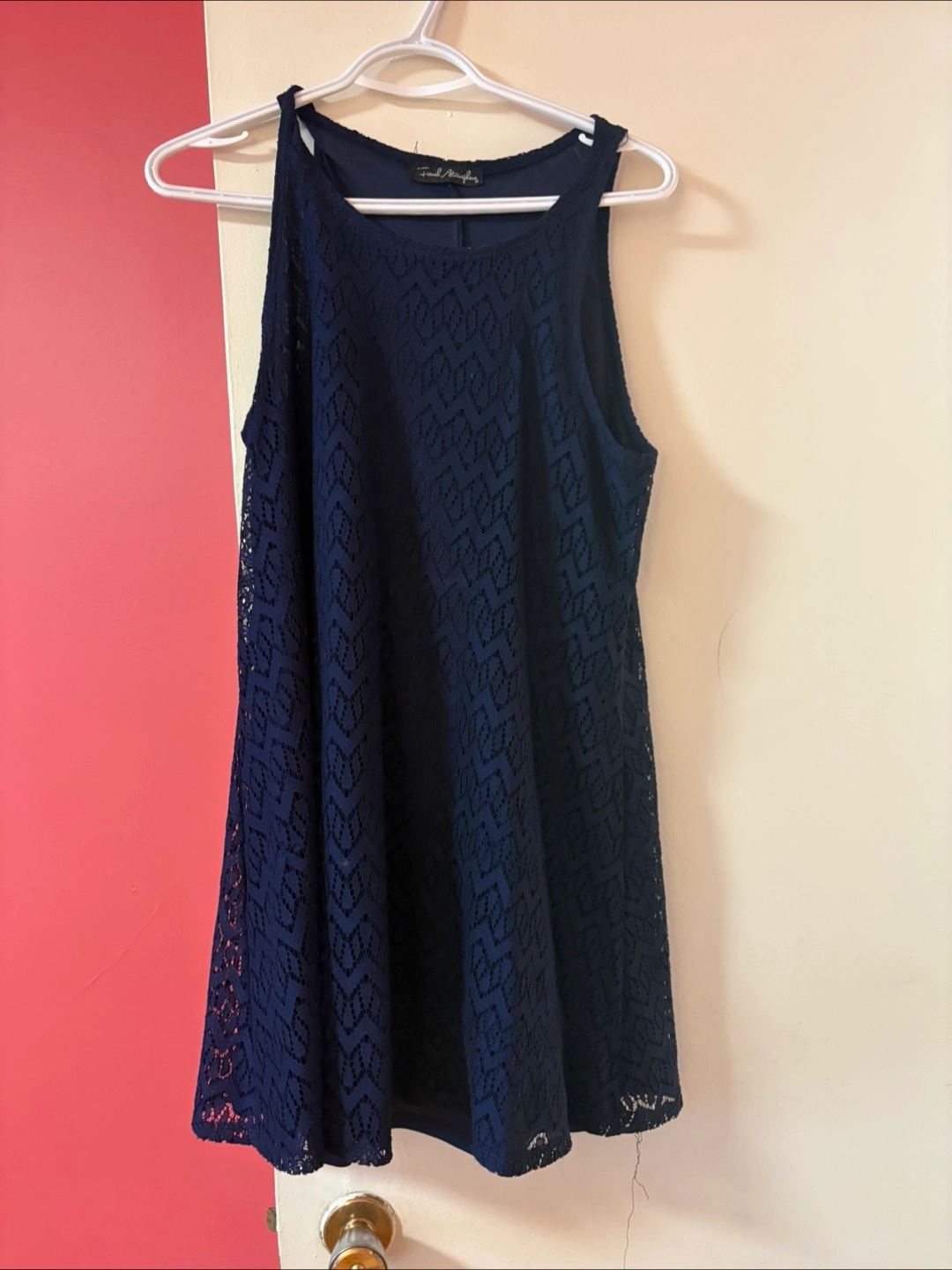 Beautiful navy blue sleeveless dress. Features a lace pattern throughout. A-line silhouette. Perfect for a summer occasion.