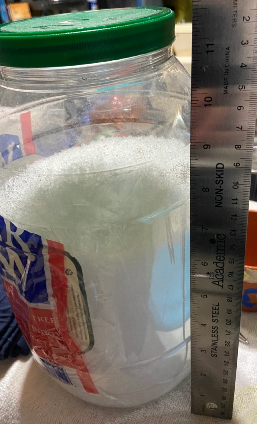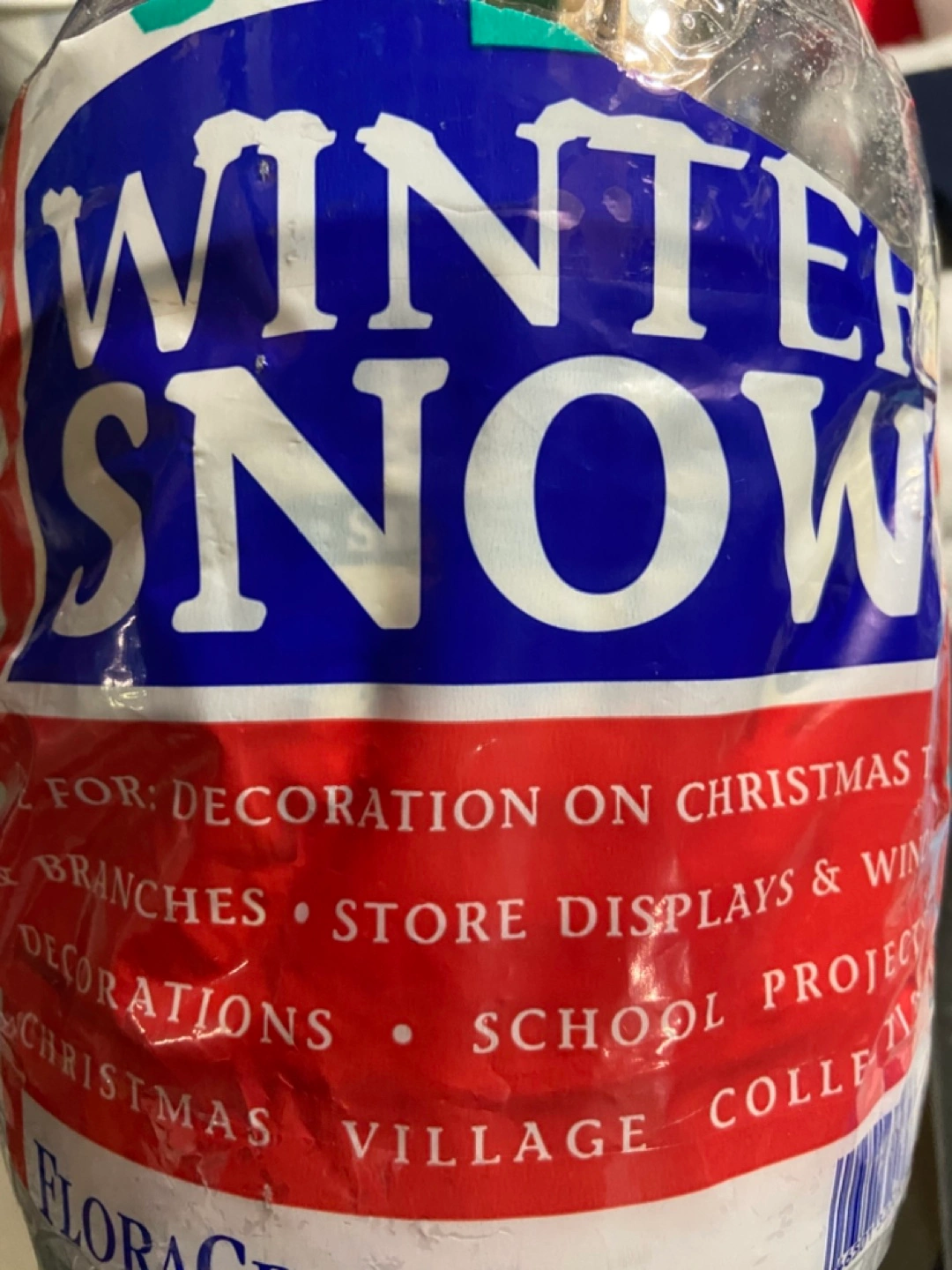 Plastic container holding artificial snow. Ideal for Christmas decorating or school projects etc. taken out of original bag and placed in this plastic container. Approximately 11 inches tall.