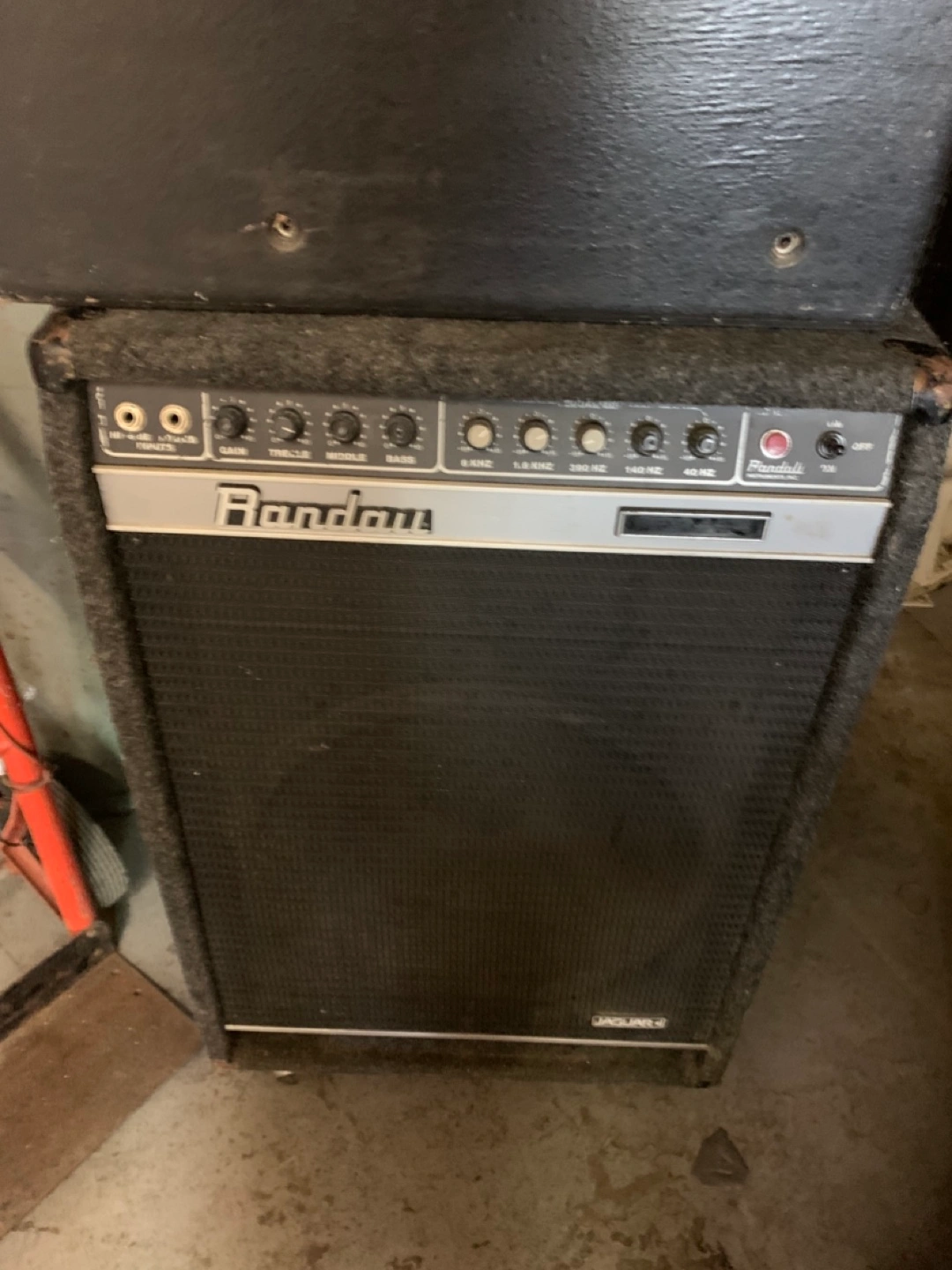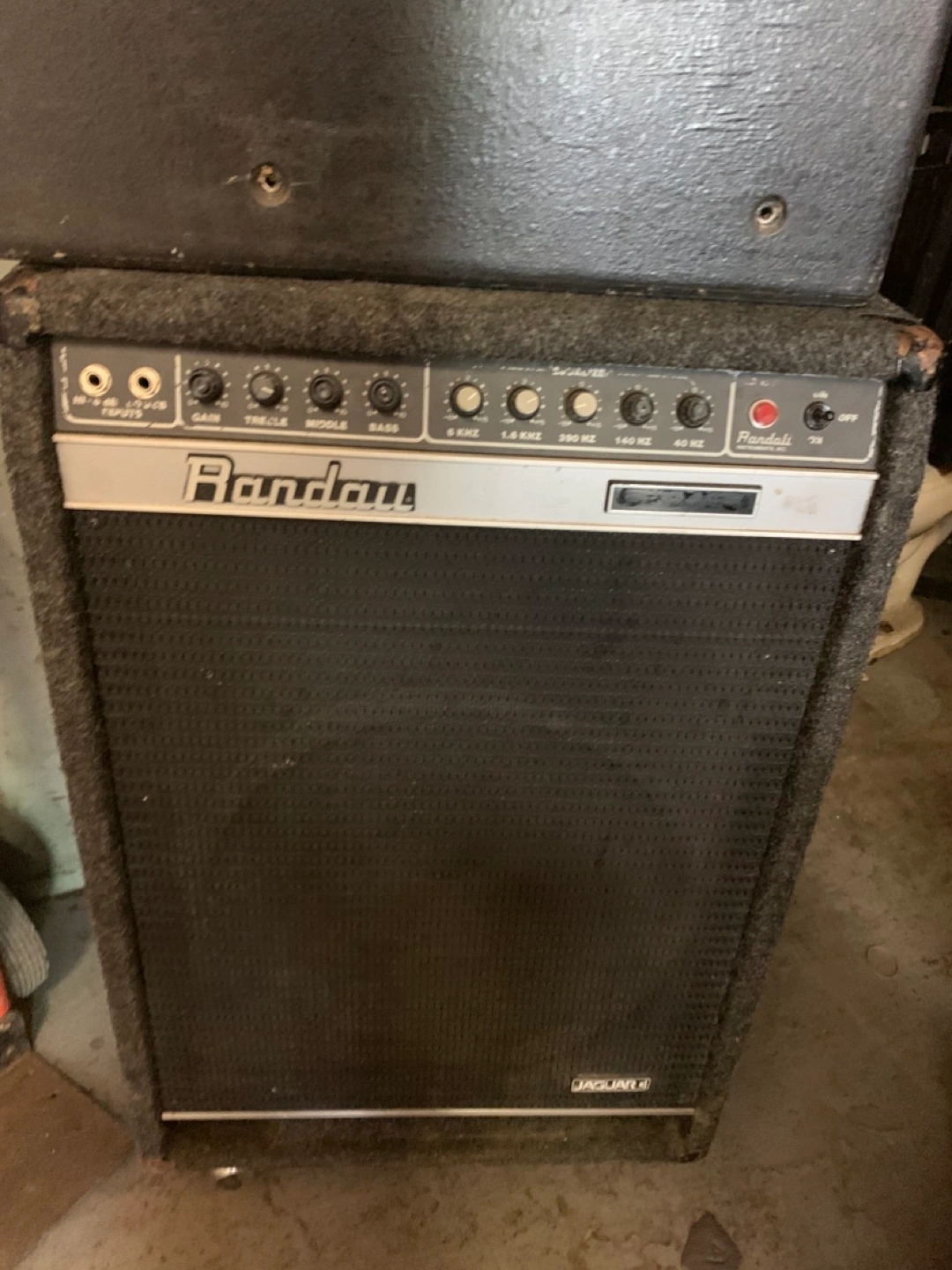 Vintage Randall Jaguar bass guitar amplifier. Great for practice or small gigs. Features multiple EQ controls and a power switch. Shows some wear from age and use.