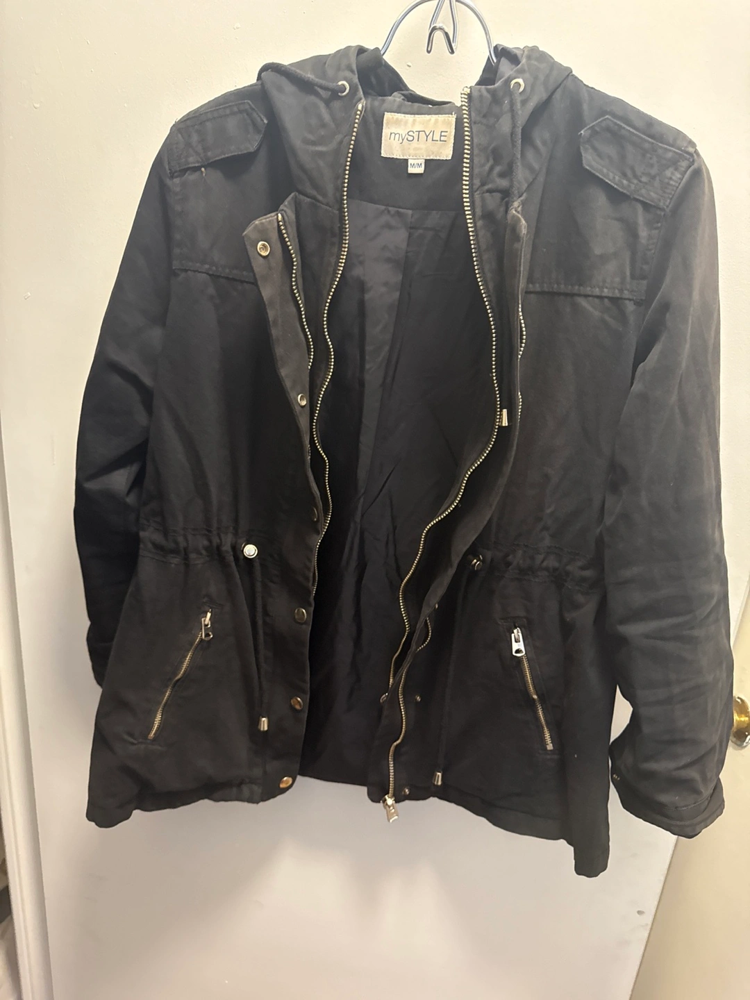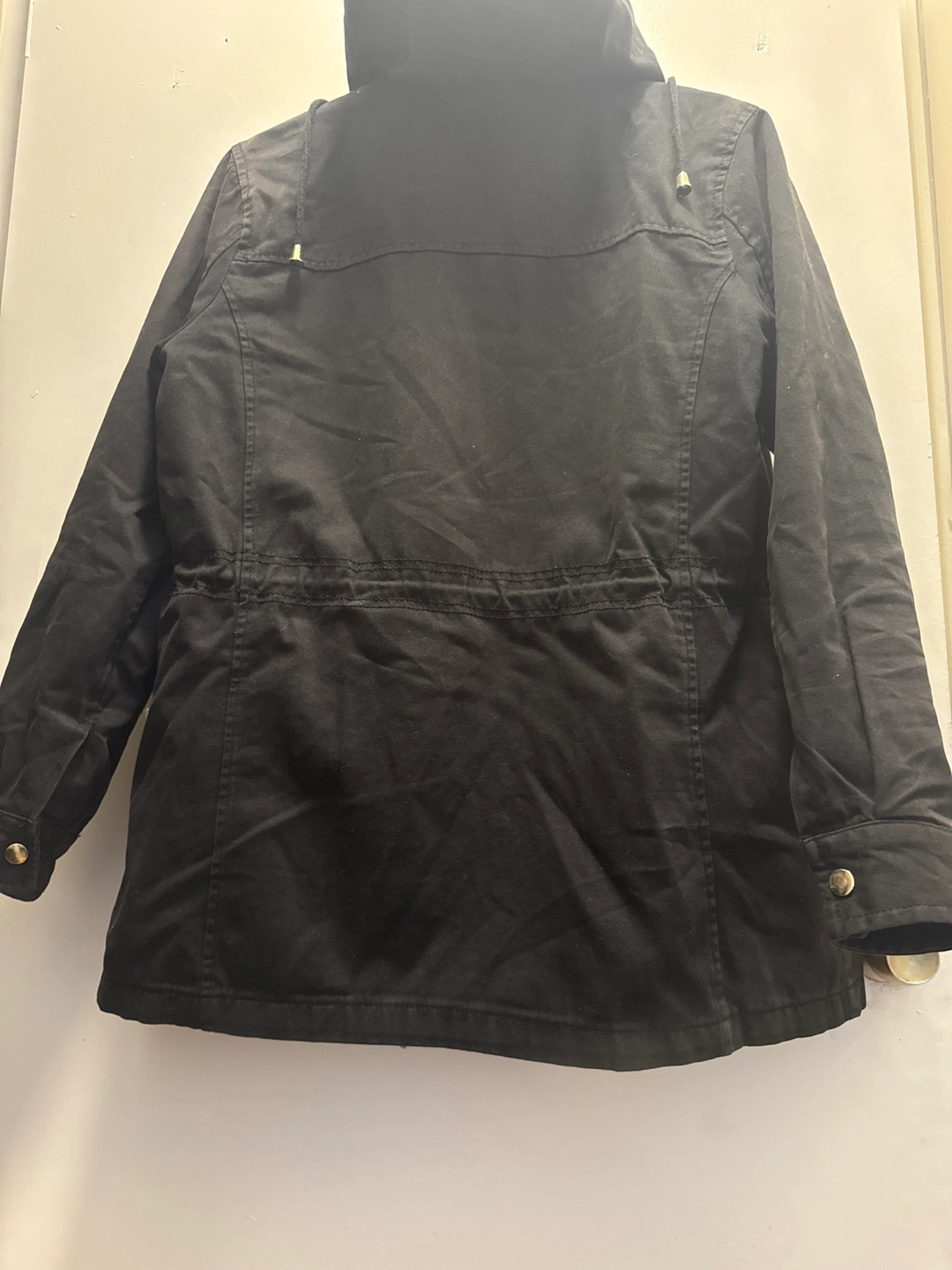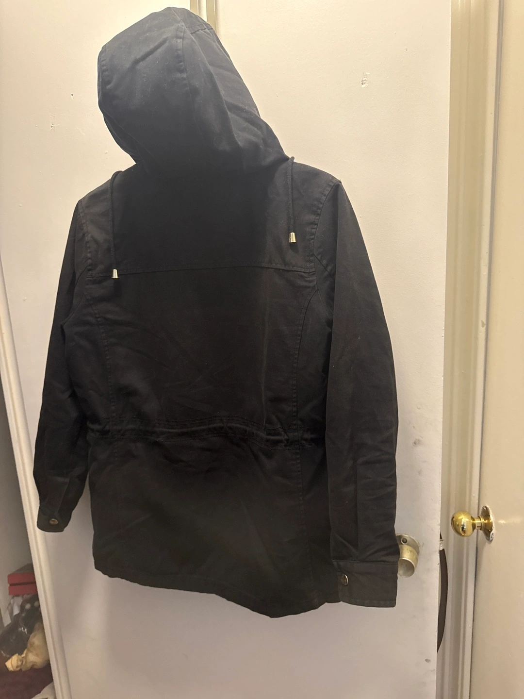 Women's black hooded jacket. Size Medium. Features zipper and button closure. Drawstring waist. Long sleeves. Multiple pockets.