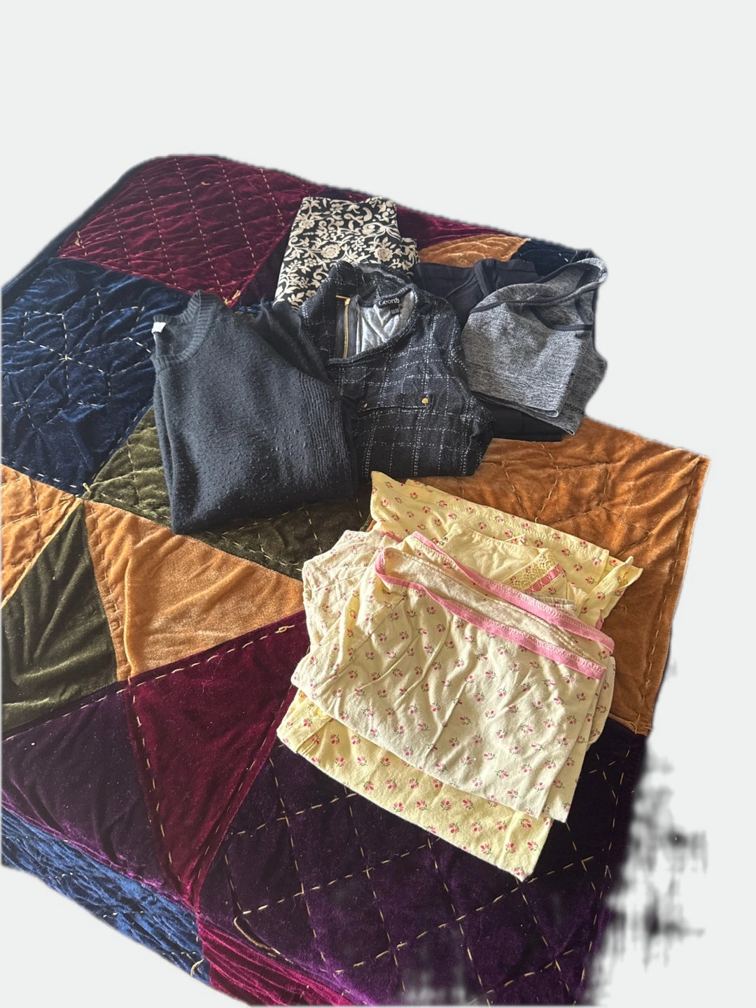 Bundle of women's clothing. Includes sweaters, tops, and sleepwear. Various colours and patterns. Sizes may vary. #freecycle