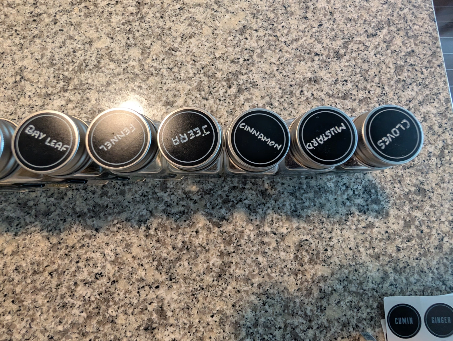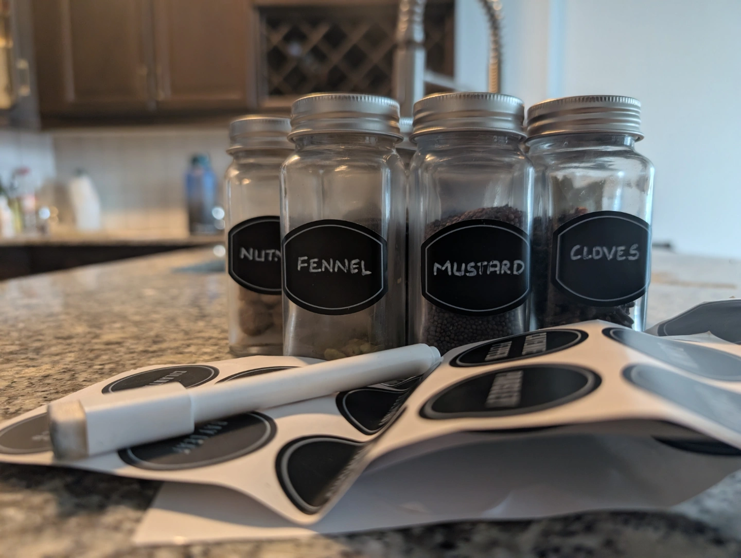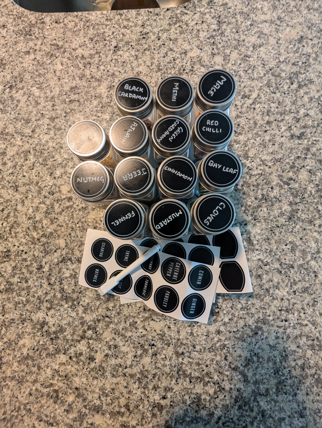 Set of empty spice jars with chalkboard labels. Great for organizing your spices. Includes extra labels and marker.